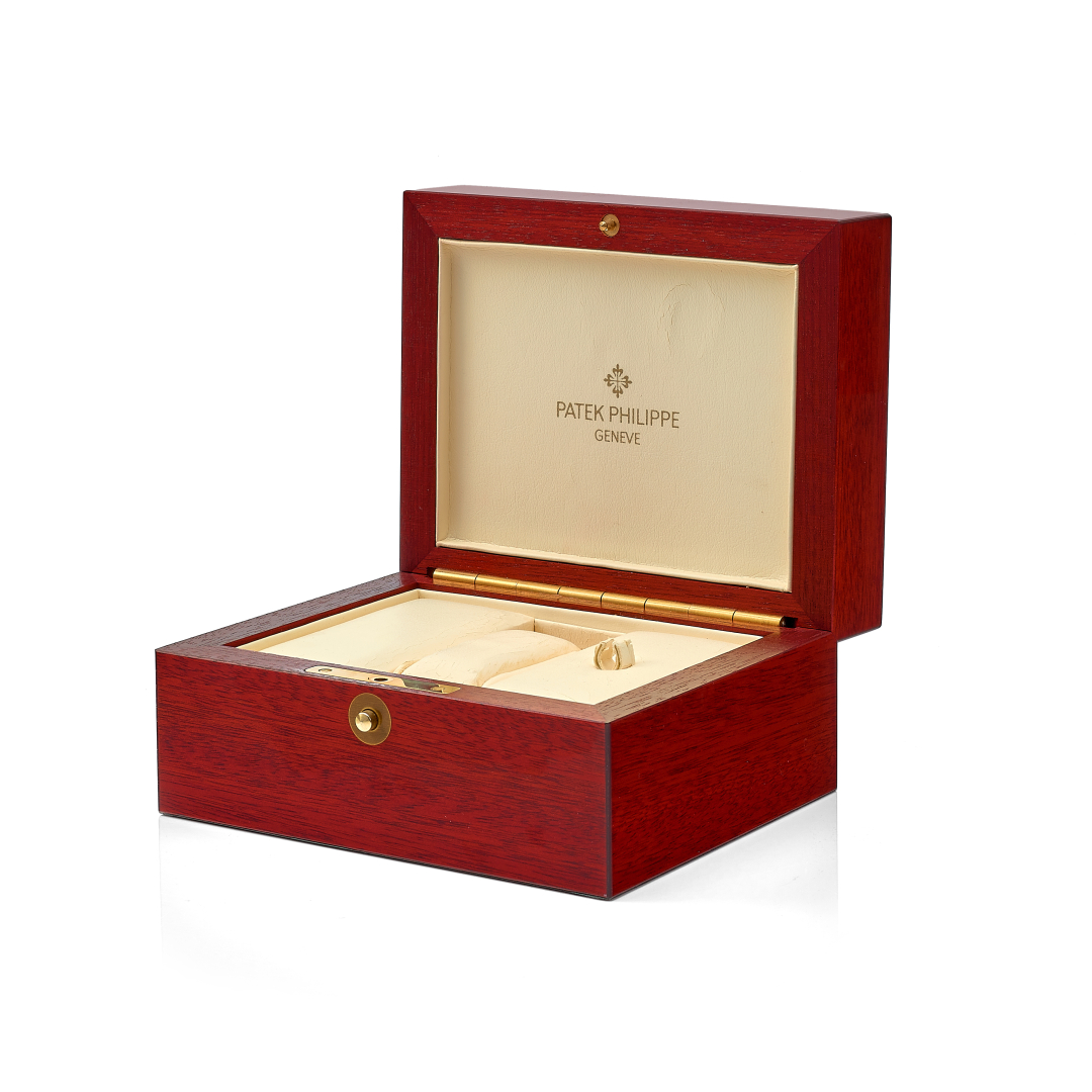 Made of polished wood, interior with defects. Fitted with outer-box.