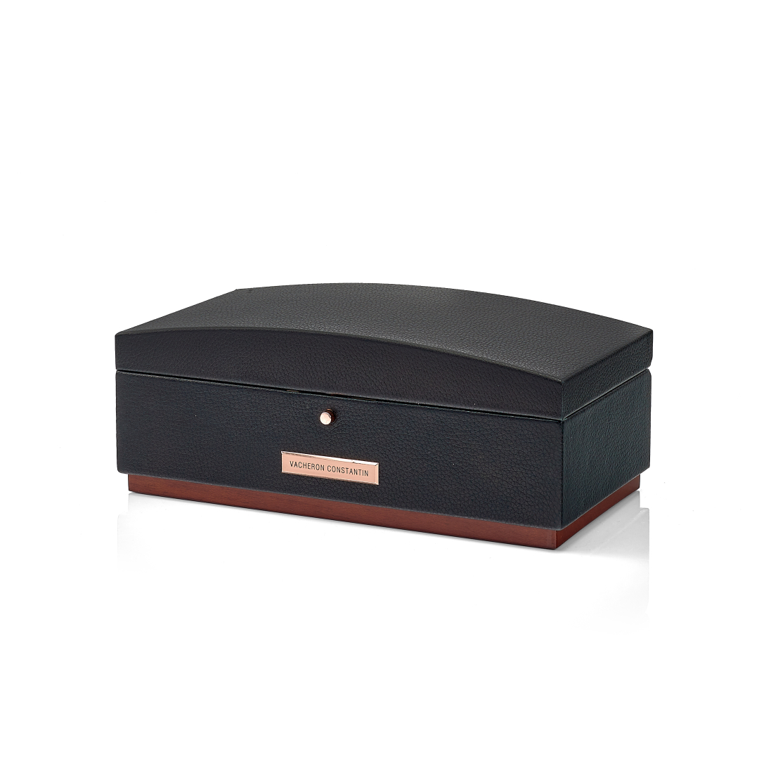 In black leather, with burl wood base (with defects inside), with outer-box.