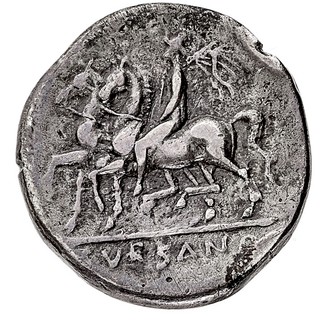 Suessa Aurunca - Didramma databile al periodo 265-240 a.C. - Diritto: testa laureata di Apollo a destra; a sinistra, nel campo, una lira - Rovescio: Dioscuro a cavallo verso sinistra tiene le redini di un secondo cavallo e un ramo di palma - gr. 6,61 - Rara - q.BB