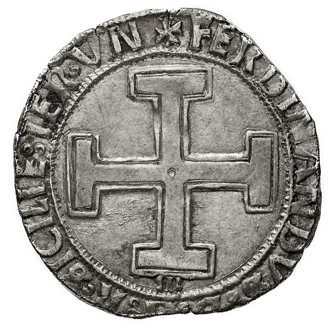 Ferdinando I d'Aragona (1458-1494) - Coronato - Zecca: Napoli - Diritto: croce potenziata - Rovescio: il Re seduto di fronte incoronato da un cardinale a sinistra; sulla destra un vescovo - gr. 3,84 - q.SPL