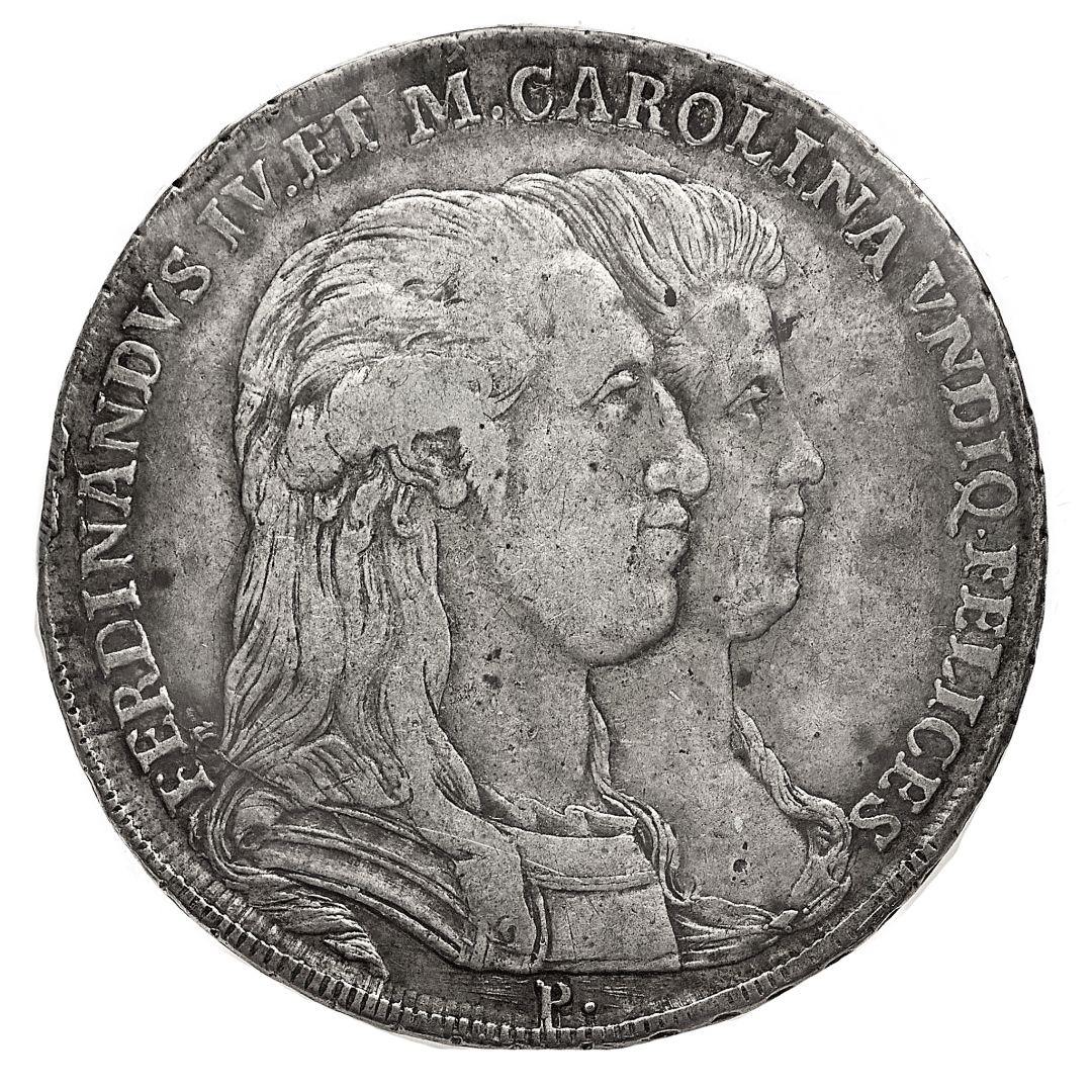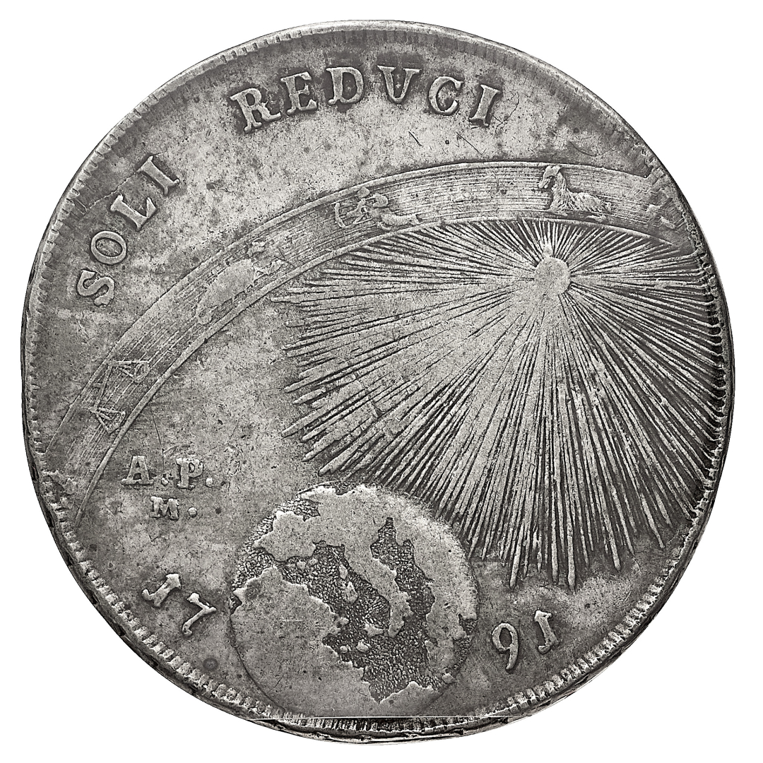 Ferdinando IV di Borbone (1759-1799) - Piastra da 120 Grana 1791 - Zecca: Napoli - Diritto: busti del Re e della Regina Maria Carolina accollati a destra - Rovescio: fascia dello zodiaco e sole raggiante che illumina il globo terrestre - Sigillata ("BB")