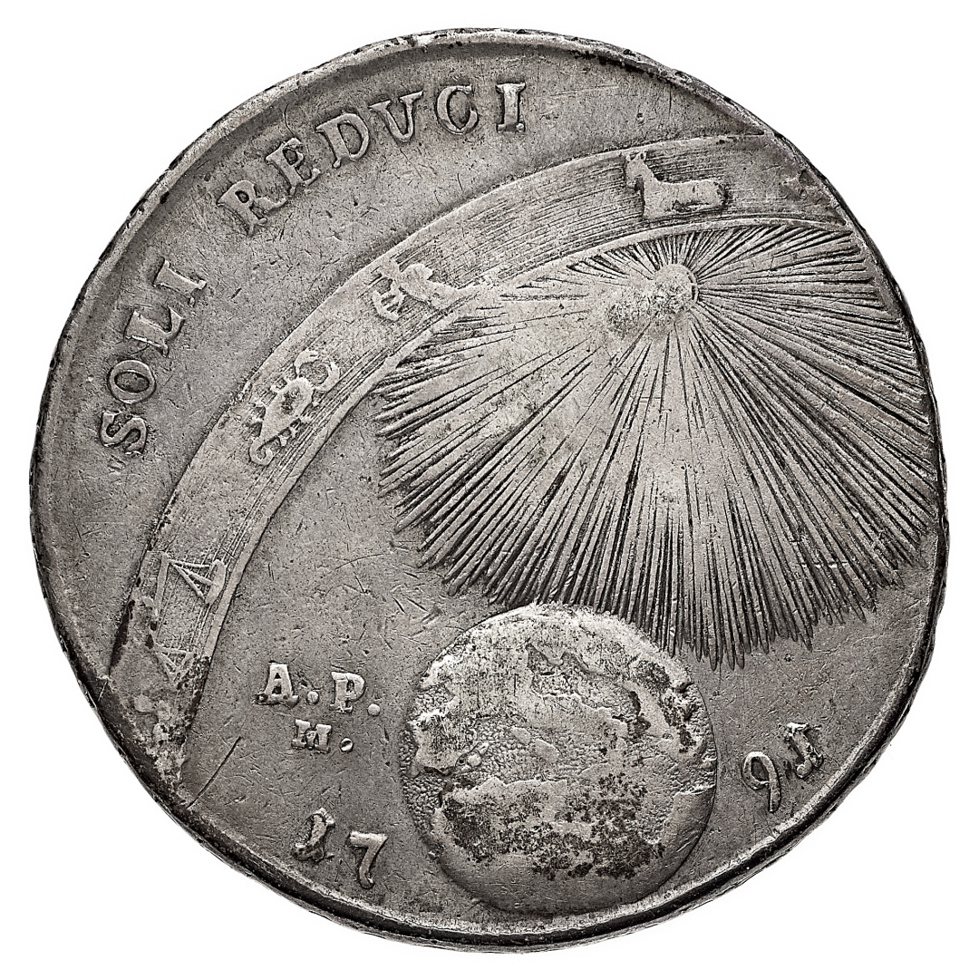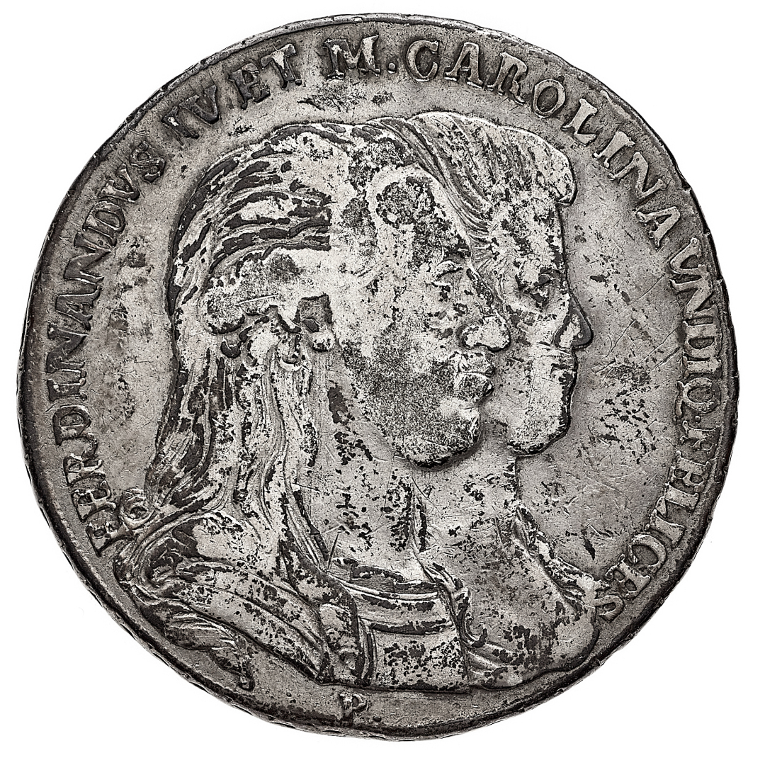 Ferdinando IV di Borbone (1759-1799) - Piastra da 120 Grana 1791 - Zecca: Napoli - Diritto: busti del Re e della Regina Maria Carolina accollati a destra - Rovescio: fascia dello zodiaco e sole raggiante che illumina il globo terrestre - gr. 26,97 - Non comune - BB