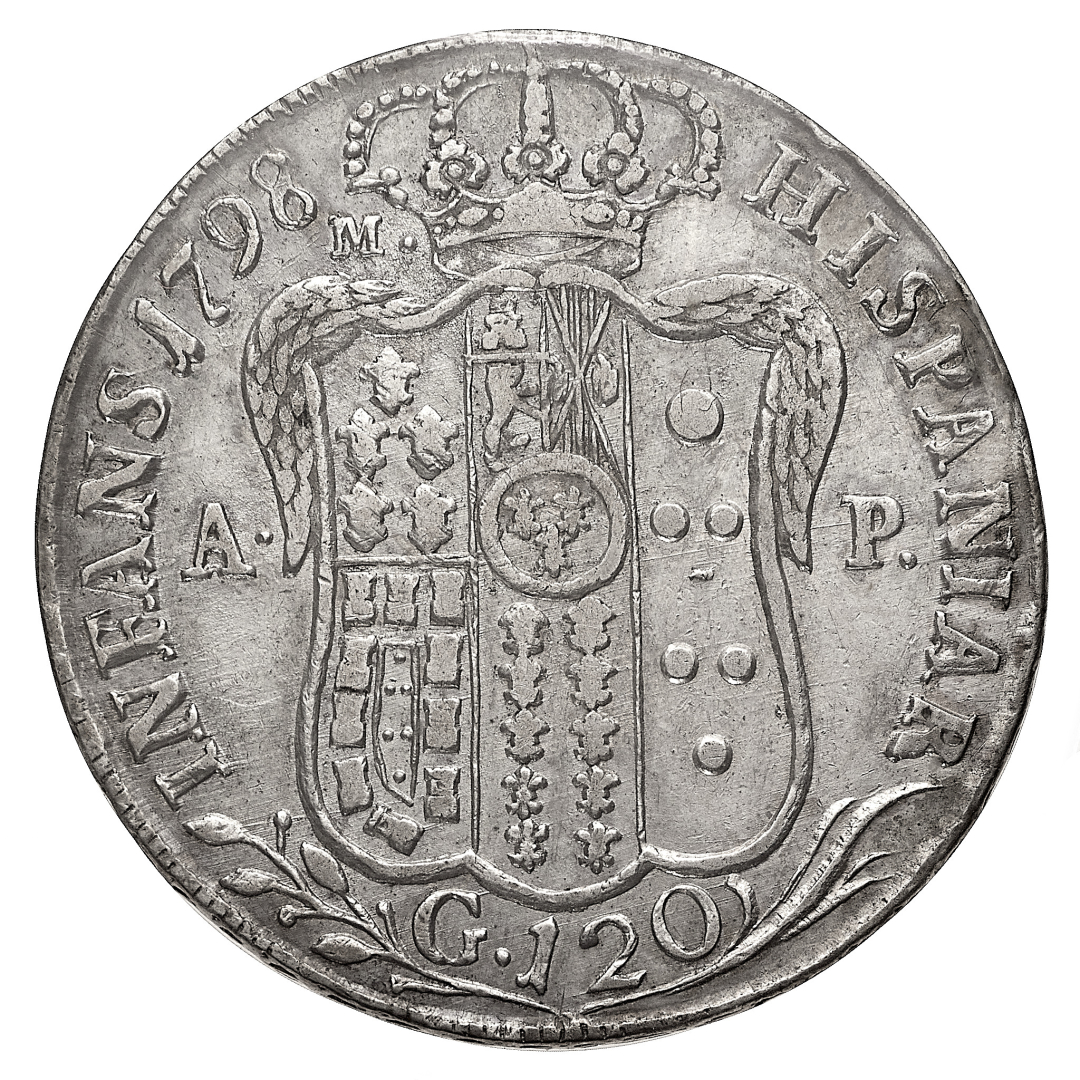 Ferdinando IV di Borbone (1799-1805) - Piastra da 120 Grana 1798 - Zecca: Napoli - Diritto: effigie del Re a destra - Rovescio: stemma coronato - Sigillata ("BB+/q.SPL")