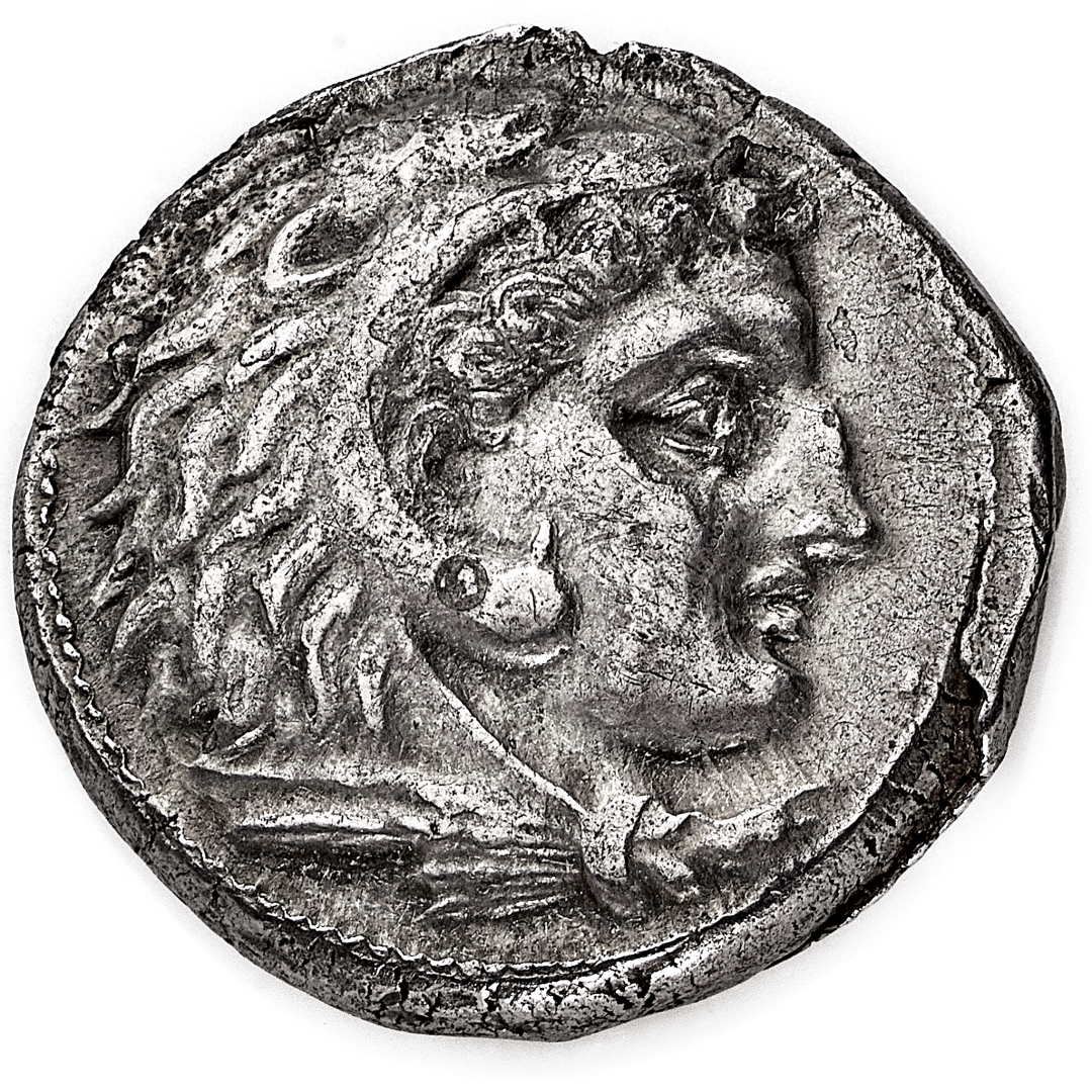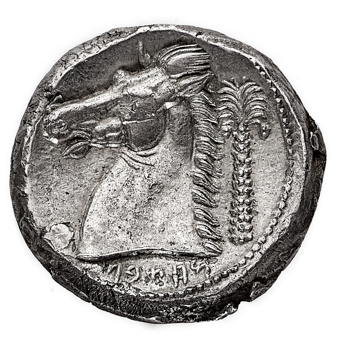 Dominazione punica - Tetradramma databile al periodo 300-289 a.C. - Zecca: Entella - Diritto: testa di Eracle a destra ricoperta dalle fauci del leone - Rovescio: protome equina a sinistra e palmizio - gr. 16,26 - SPL