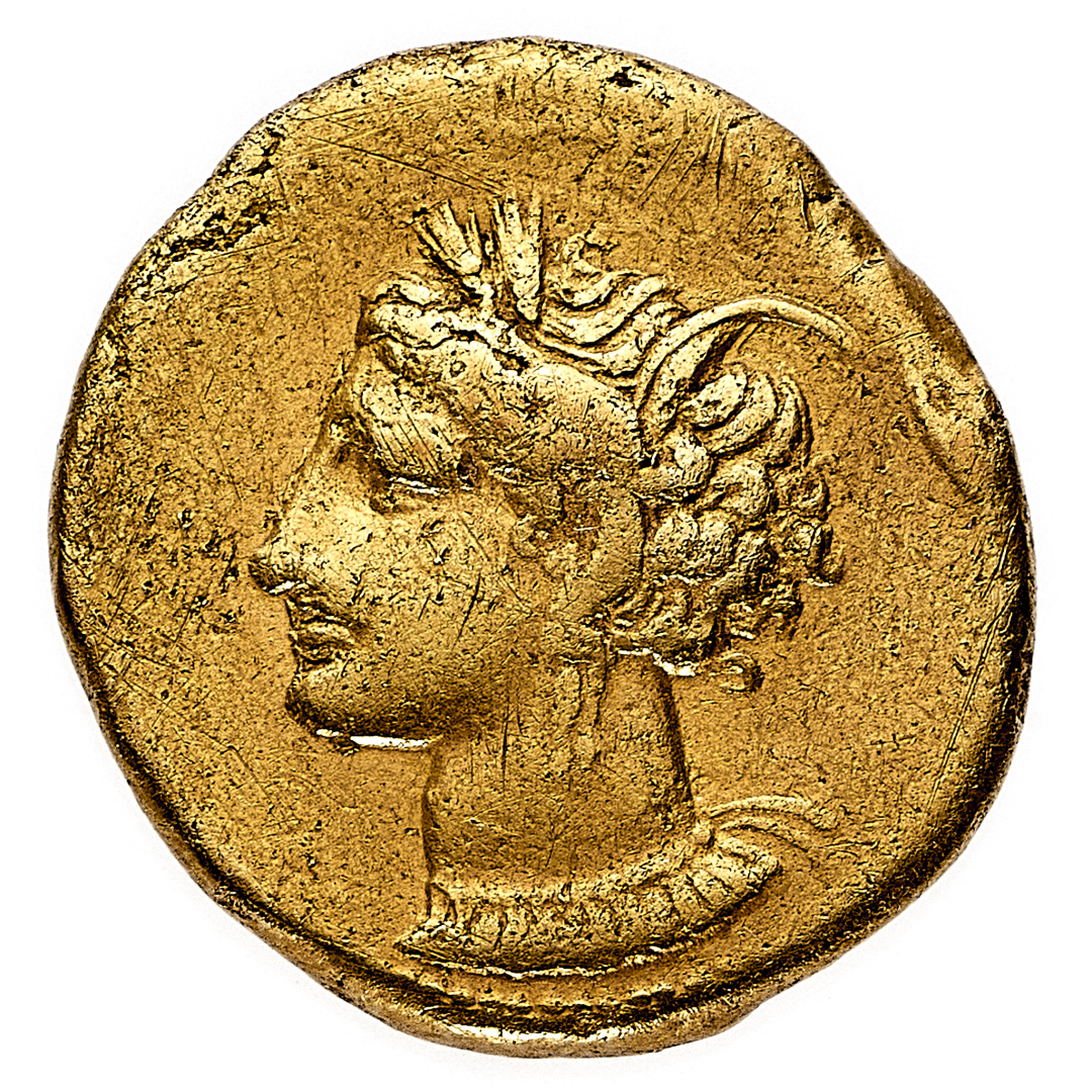 Cartagine - Statere in elettro databile al periodo 310-270 a.C. - Diritto: testa di Persefone a sinistra con la capigliatura raccolta e fermata da una corona di spighe e con collier di pendenti - Rovescio: cavallo stante a destra - gr. 7,40 - BB