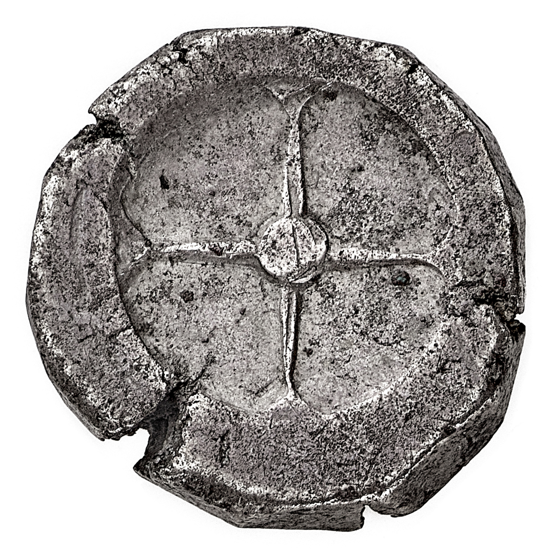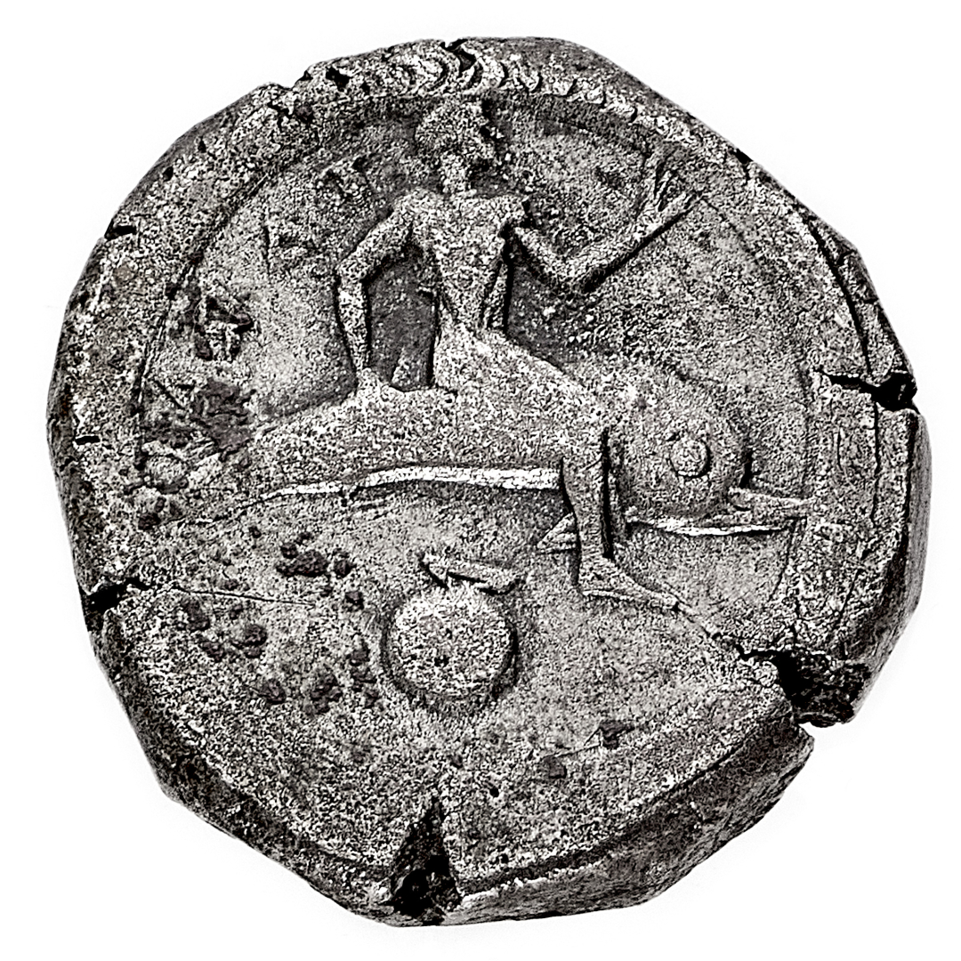 Taranto - Didramma databile al periodo 520-500 a.C. - Diritto: Pahalantos in groppa al delfino verso sinistra allunga entrambe le braccia; sotto il delfino, una conchiglia - Rovescio: ruota a quattro raggi - gr. 7,92 - Rara - Migliore di BB