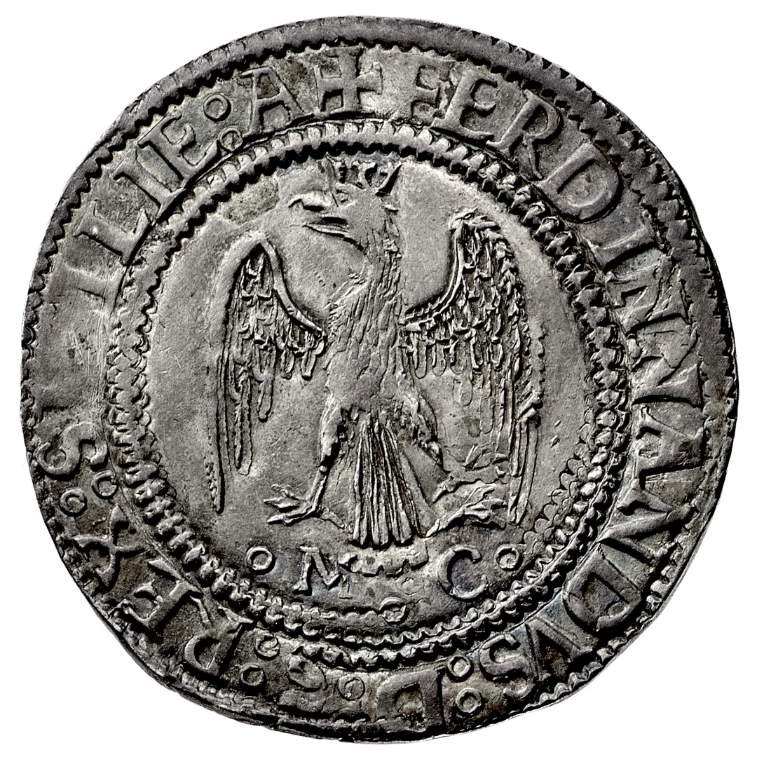 Ferdinando il Cattolico (1479-1516) - Tarì - Zecca: Messina - Diritto: stemma coronato - Rovescio: aquila coronata ad ali spiegate - gr. 3,61 - Splendida patina iridescente, SPL