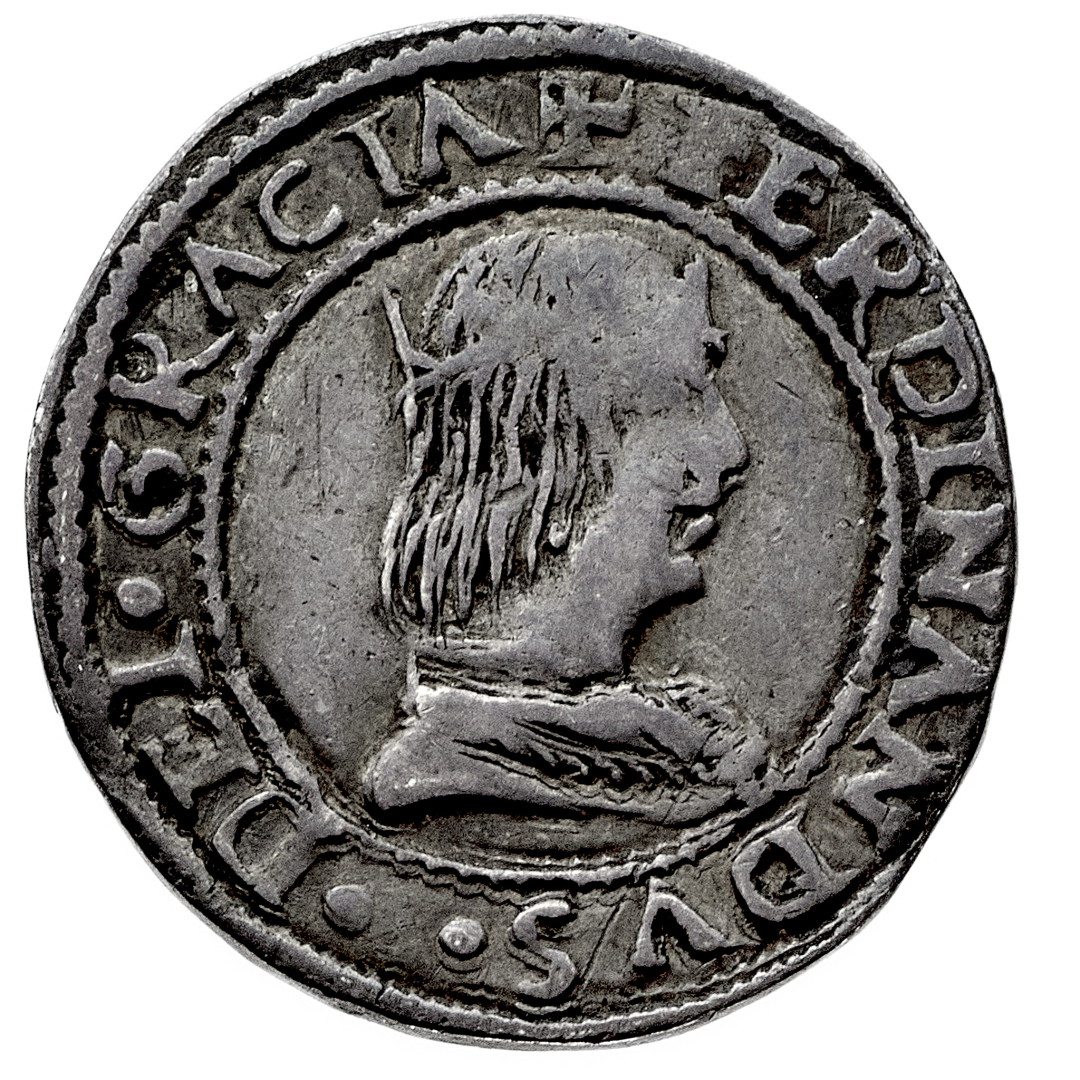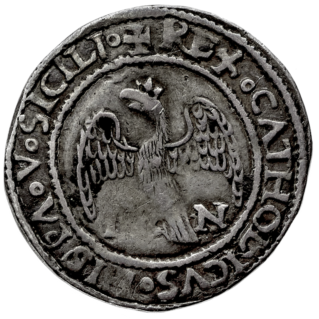Ferdinando il Cattolico (1479-1516) - Tarì - Zecca: Messina - Diritto: busto coronato a destra - Rovescio: aquila coronata ad ali spiegate - gr. 3,02 - Molto rara - Tondello lievemente ondulato, q.BB