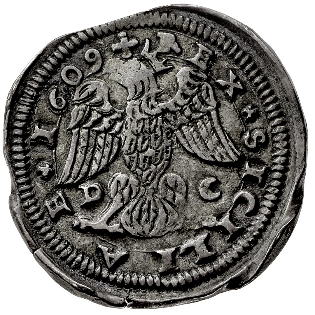 Filippo III di Spagna (1598-1621) - 4 Tarì 1609 - Zecca: Messina - Diritto: busto corazzato del Re a destra - Rovescio: aquila coronata di fronte ad ali spiegate - gr. 10,43 - Migliore di BB