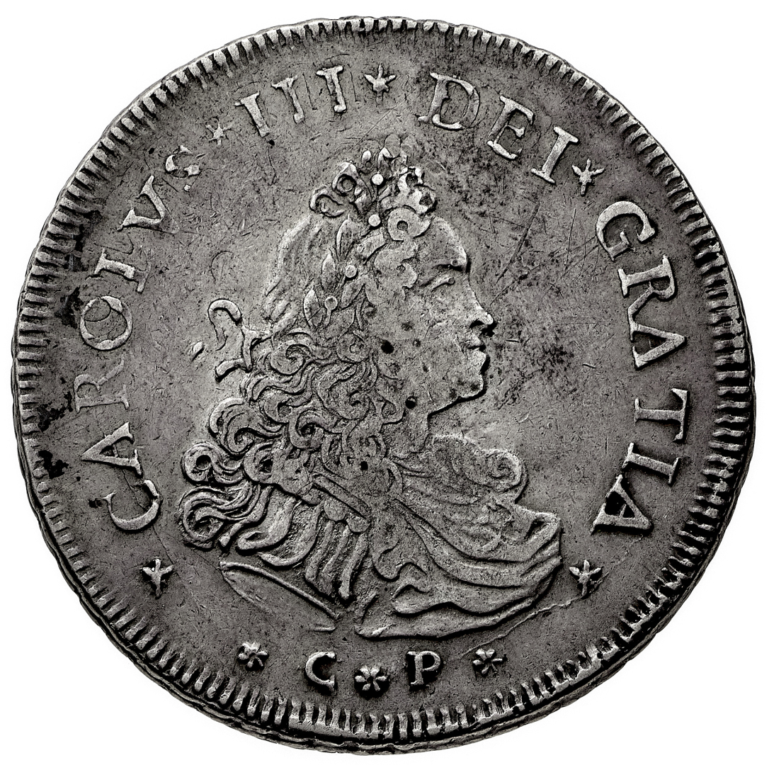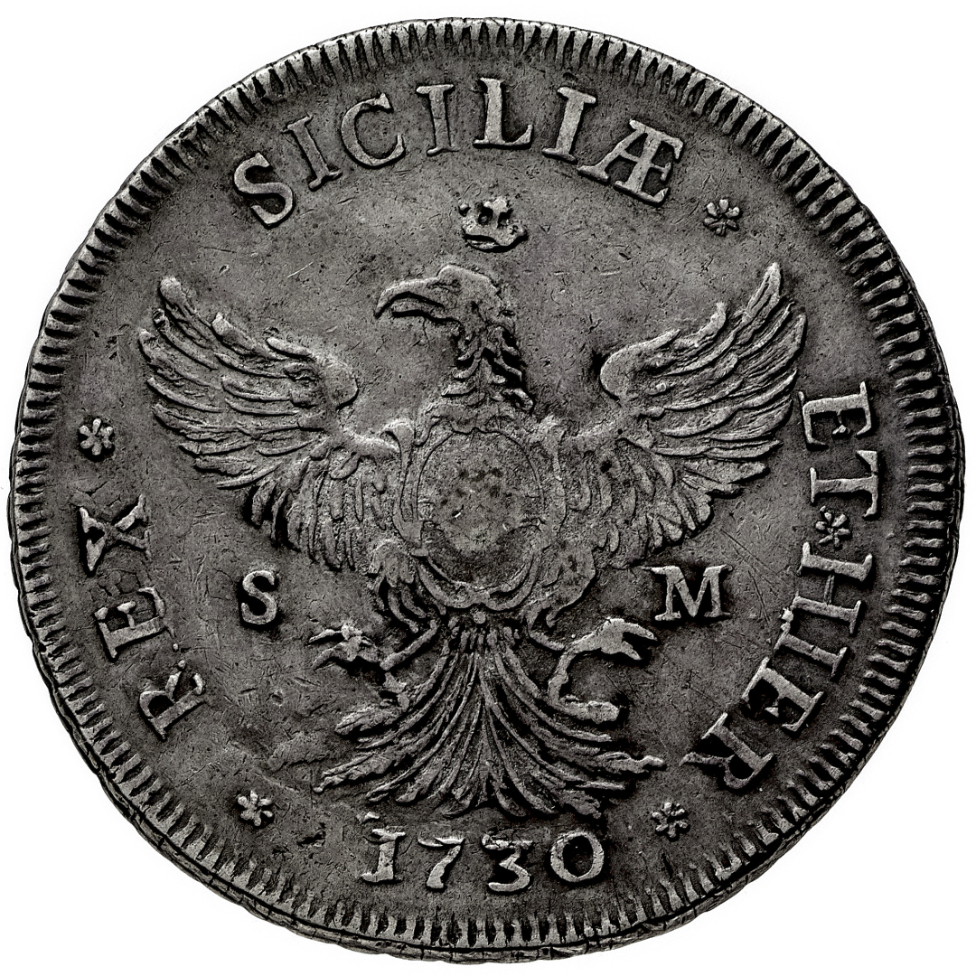 Carlo III d'Asburgo (1720-1734) - 12 Tarì 1730 - Zecca: Palermo - Diritto: effigie del Re a destra - Rovescio: aquila coronata con stemma asburgico sul petto - gr. 29,10 - Molto rara - Migliore di BB