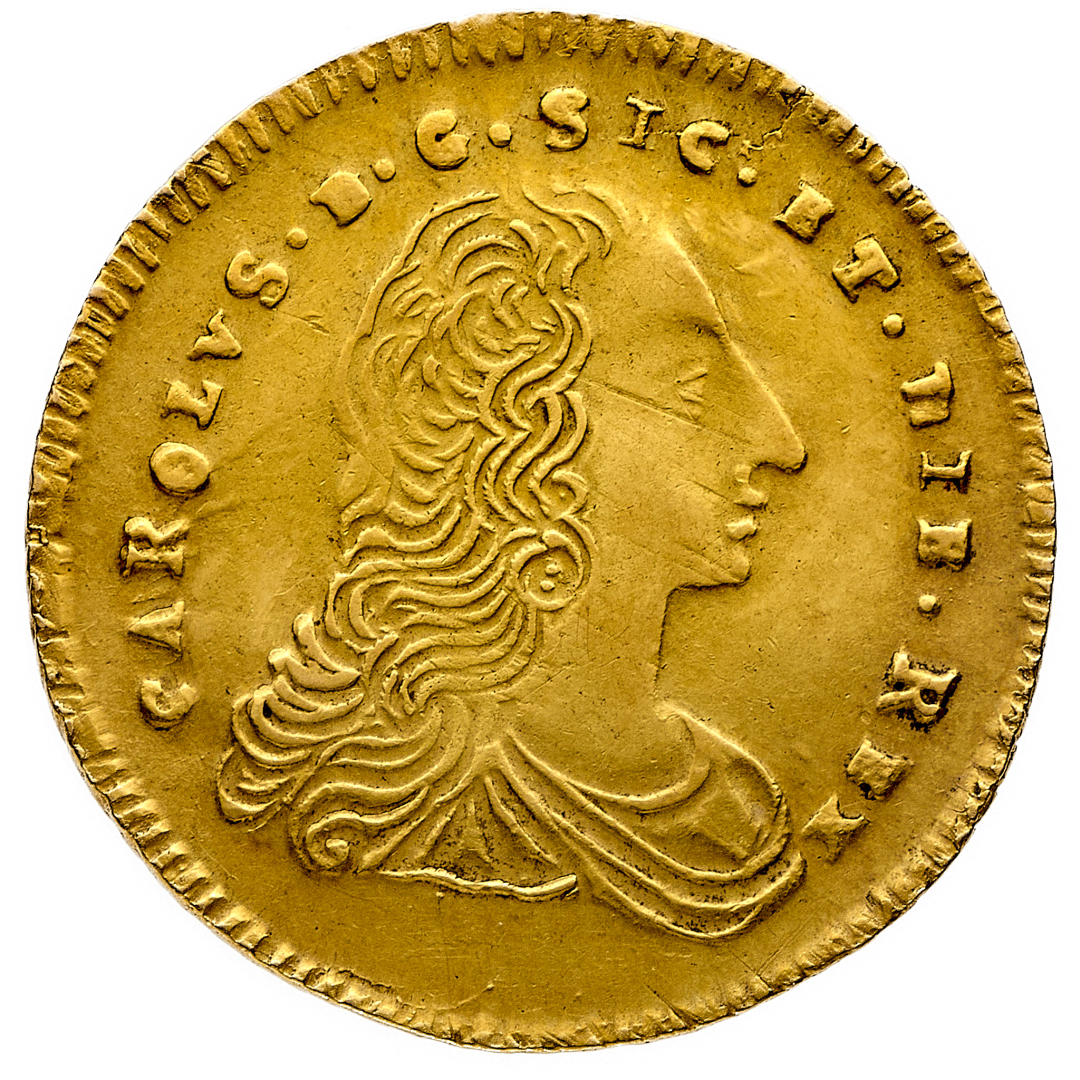 Carlo III di Borbone (1734-1759) - Doppia Oncia 1754 - Zecca: Palermo - Diritto: effigie del Re a destra - Rovescio: aquila coronata ad ali spiegate con stemma sul petto - gr. 8,83 - Non comune - q.SPL