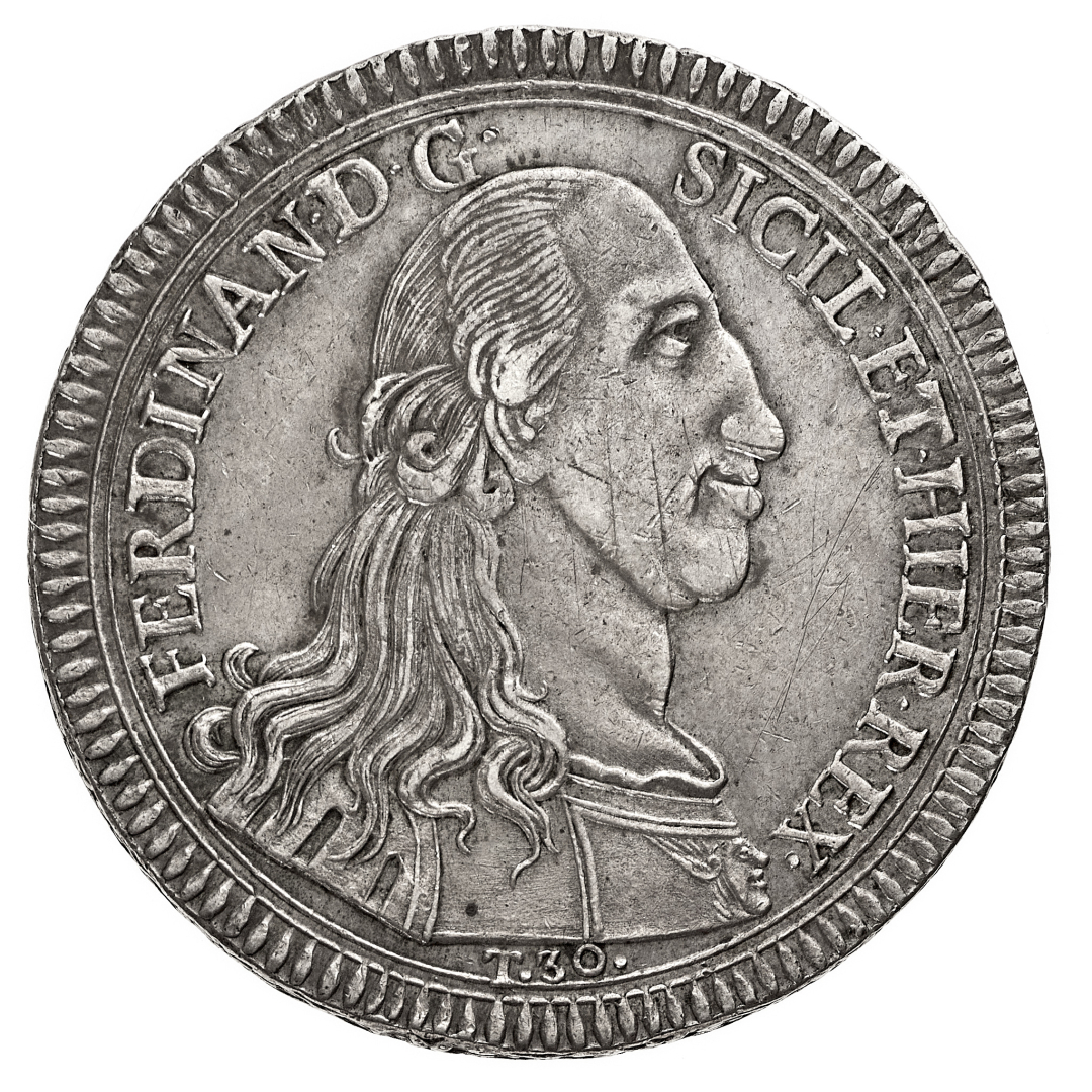 Ferdinando III di Borbone (1759-1816) - Oncia d'argento da 30 Tarì 1793 - Zecca: Palermo - Diritto: busto corazzato del Re a destra - Rovescio: la Fenice ad ali spiegate con la testa rivolta a destra - gr. 68,34 - Lievi depositi al rovescio, migliore di BB