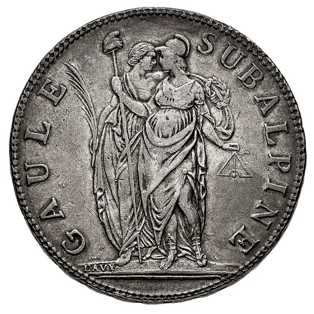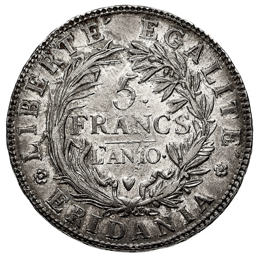 5 Franchi Anno 10° - Zecca: Torino - Diritto: due figure allegoriche stanti con simboli della Rivoluzione Francese - Rovescio: valore, data e segno di zecca entro due rami di palma e di alloro intrecciati alla base - gr. 24,94 - q.SPL
