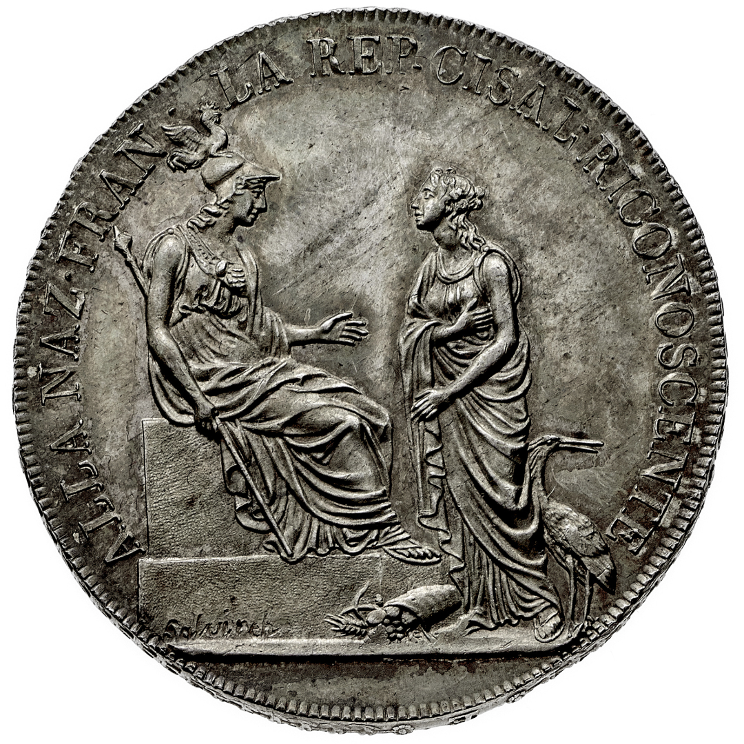 Scudo da 6 Lire Anno VIII (1799-1800) NGC MS 63 - Zecca: Milano - Diritto: la Repubblica Cisalpina stante a sinistra ringrazia la Francia seduta a destra - Rovescio: valore e data entro corona di quercia - gr. 23,15 - Cert. #8585048-018