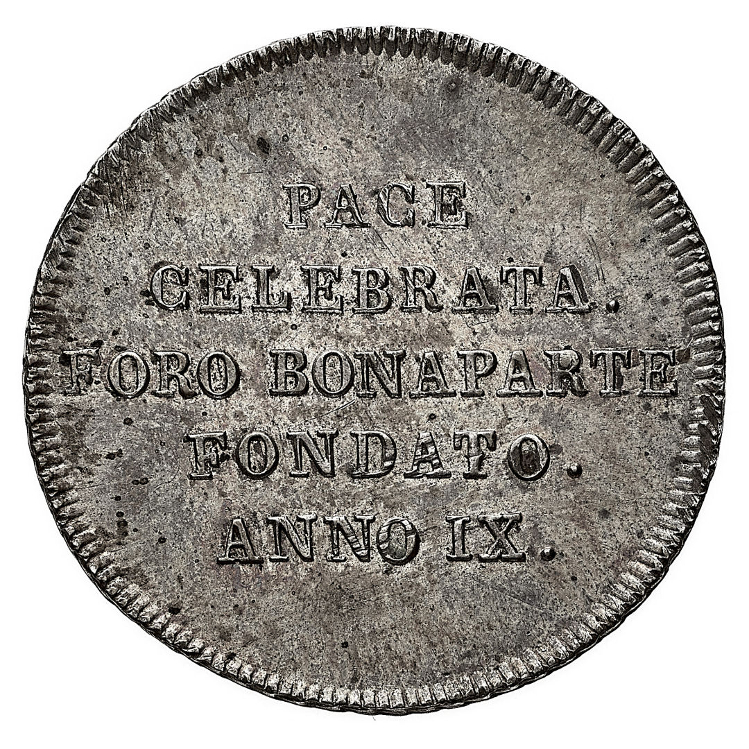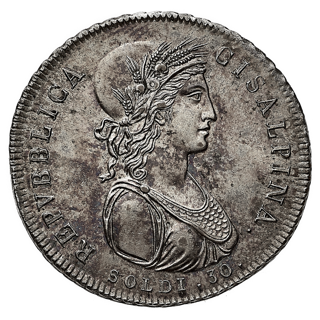 30 Soldi Anno IX (1800-1801) - Zecca: Milano - Diritto: effigie muliebre a destra, allegoria della Repubblica - Rovescio: legenda e data su cinque righe orizzontali - gr. 7,33 - Patina iridescente, q.FDC