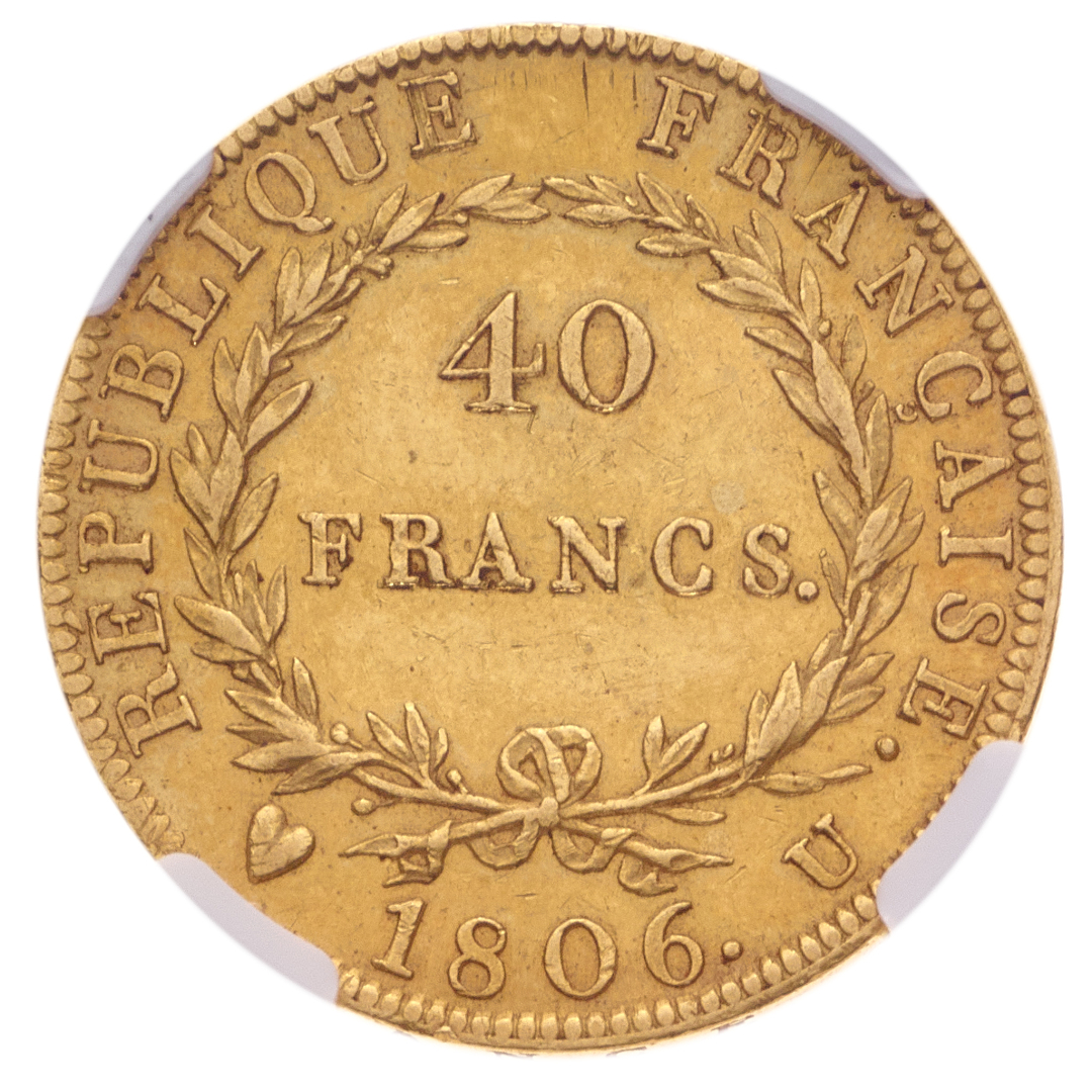 Napoleone I Imperatore dei Francesi (1804-1815) - 40 Franchi 1806 NGC AU 58 - Zecca: Torino - Diritto: effigie di Napoleone a sinistra - Rovescio: valore entro corona di alloro - Cert. #2153715-061