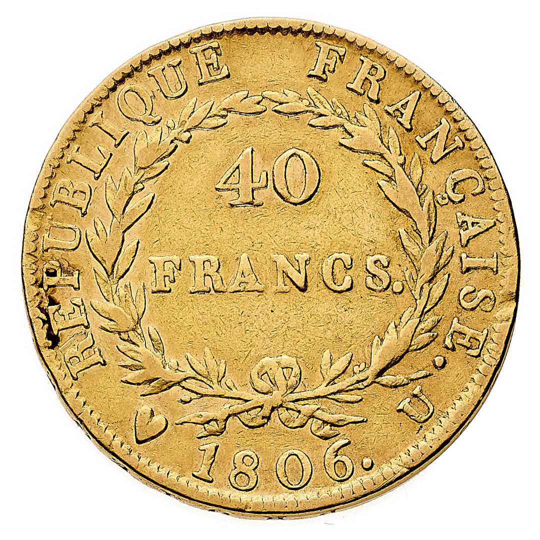 Napoleone I Imperatore dei Francesi (1804-1814) - 40 Franchi 1806 - Zecca: Torino - Diritto: effigie di Napoleone a sinistra - Rovescio: valore entro corona di alloro - gr. 12,88 - BB