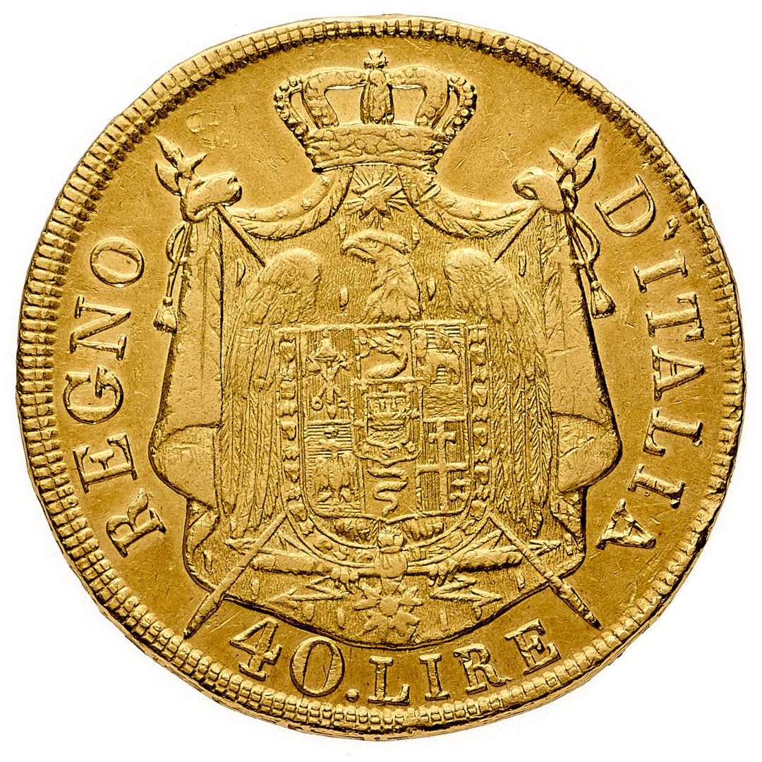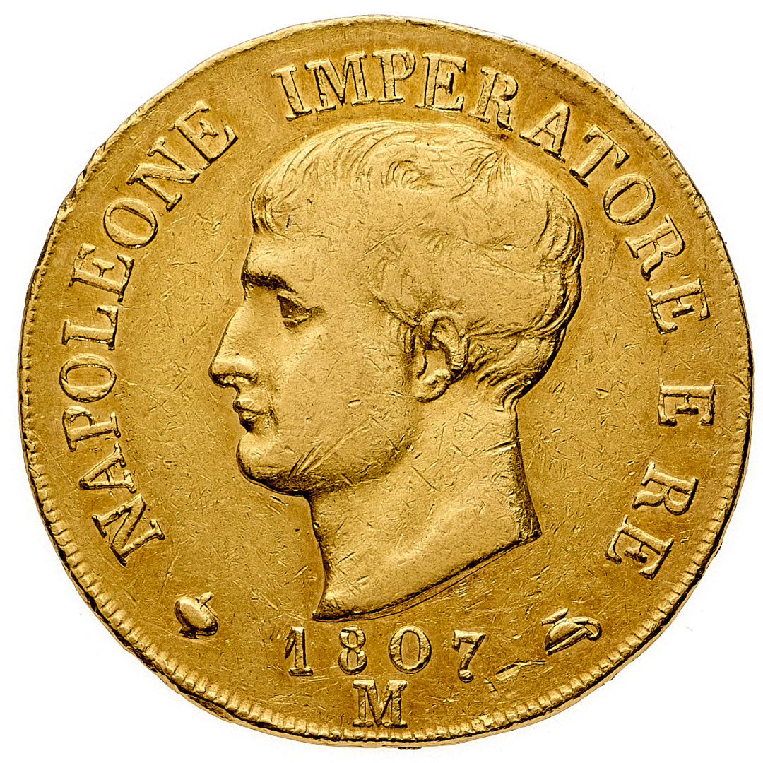 Napoleone I Re d'Italia (1805-1814) - 40 Lire 1807 - Zecca: Milano - Diritto: effigie di Napoleone a sinistra - Rovescio: stemma sovrapposto all'aquila napoleonica entro un padiglione coronato e riccamente ornato - gr. 12,88 - Molto rara - Lucentezza dei fondi parzialmente conservata, SPL