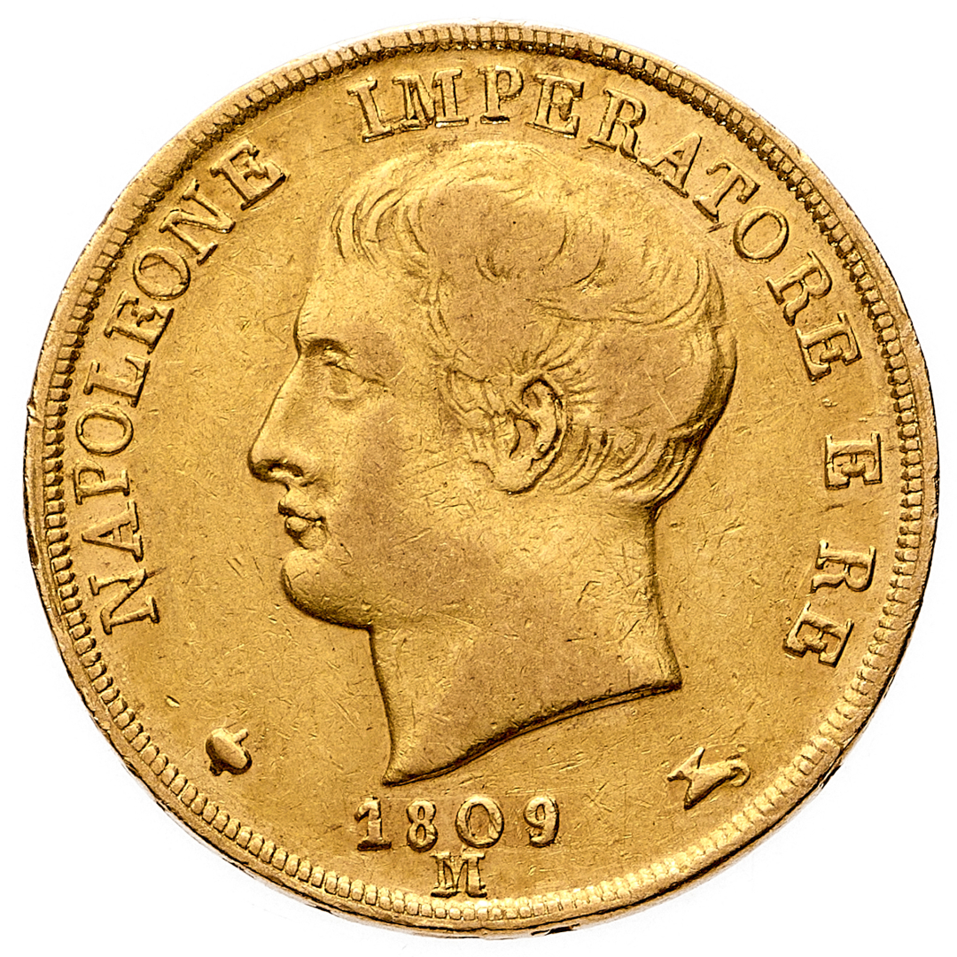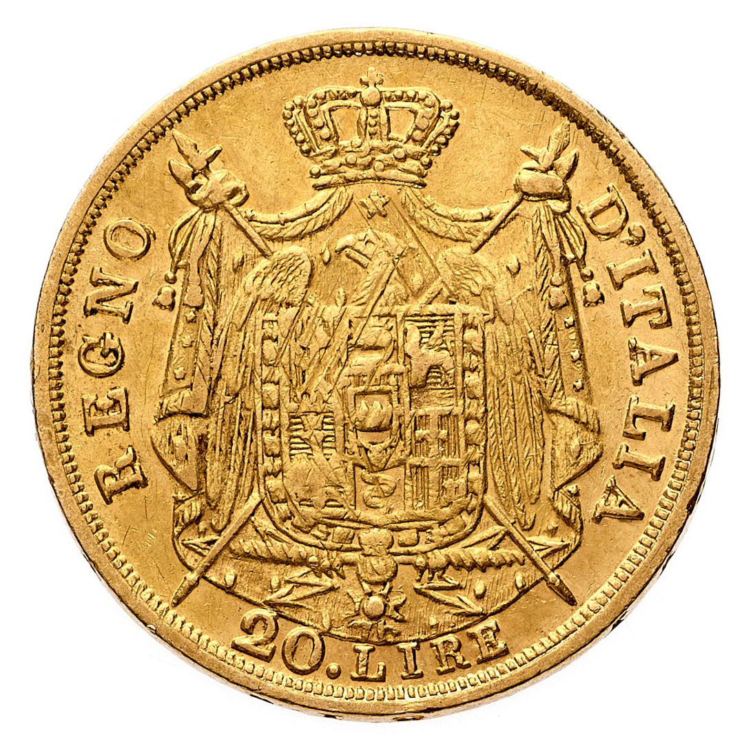 Napoleone I Re d'Italia (1805-1814) - 20 Lire 1809 - Zecca: Milano - Diritto: effigie di Napoleone a sinistra - Rovescio: stemma sovrapposto all'aquila napoleonica entro un padiglione coronato e riccamente ornato - gr. 6,43 - BB