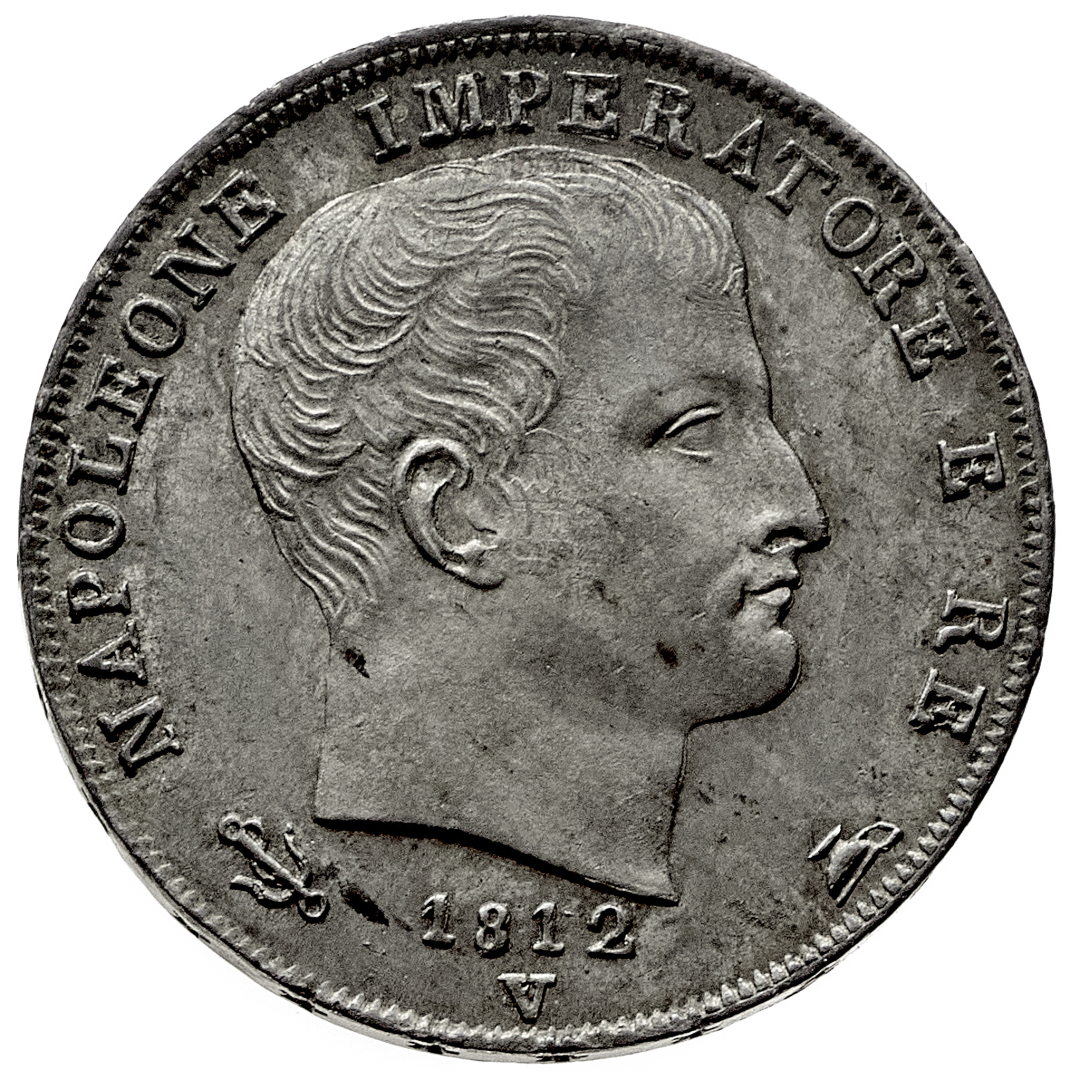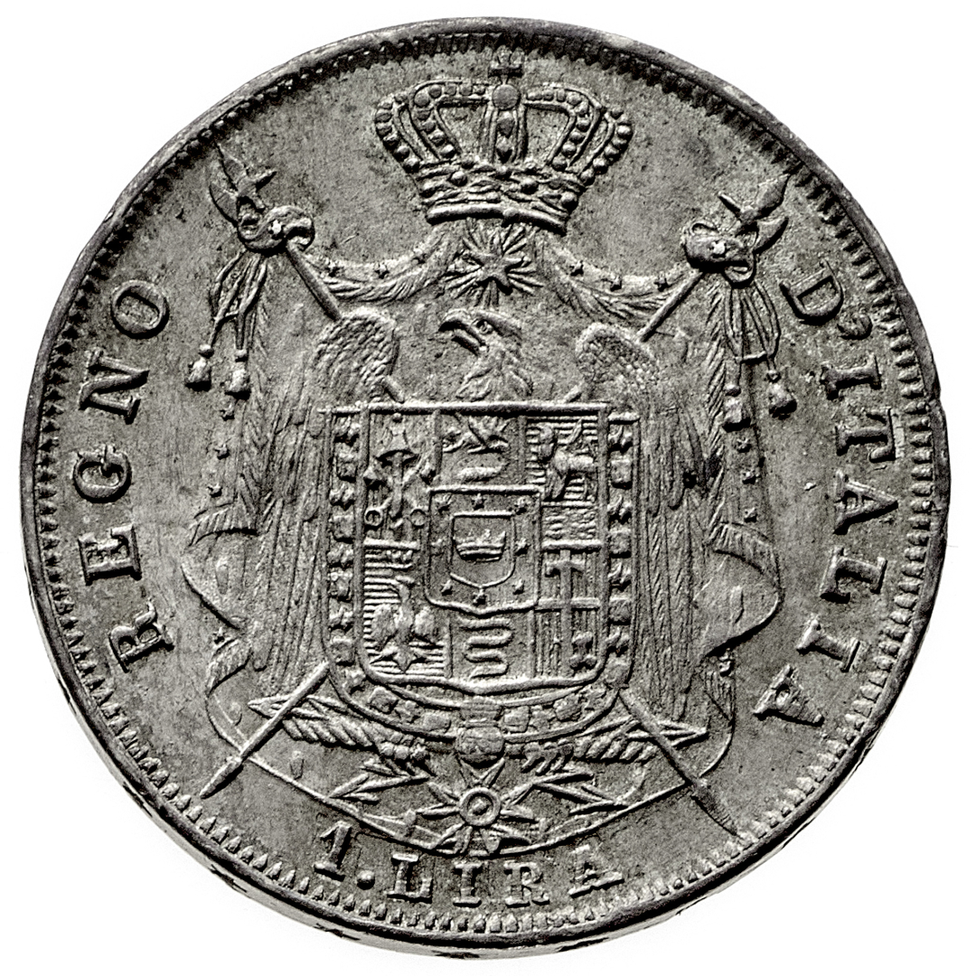 Napoleone I Re d'Italia (1805-1814) - 1 Lira 1812 - Zecca: Venezia - Diritto: effigie di Napoleone a destra - Rovescio: stemma sovrapposto all'aquila napoleonica entro un padiglione coronato e riccamente ornato - gr. 5,02 - Rara - Patina di medagliere, migliore di SPL