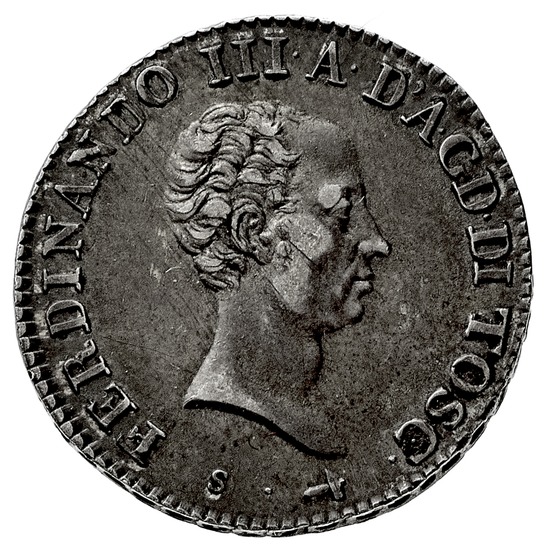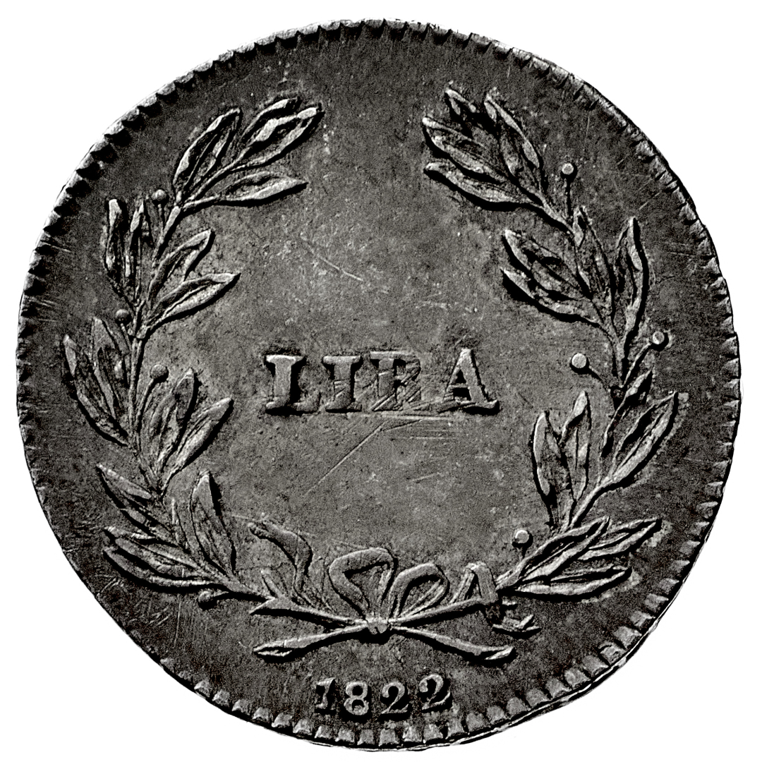 Ferdinando III di Lorena (1814-1824) - Lira 1822 - Zecca: Firenze - Diritto: effigie del Granduca a destra - Rovescio: valore entro due rami di alloro - gr. 3,96 - Non comune - Splendida patina di medagliere, q.SPL