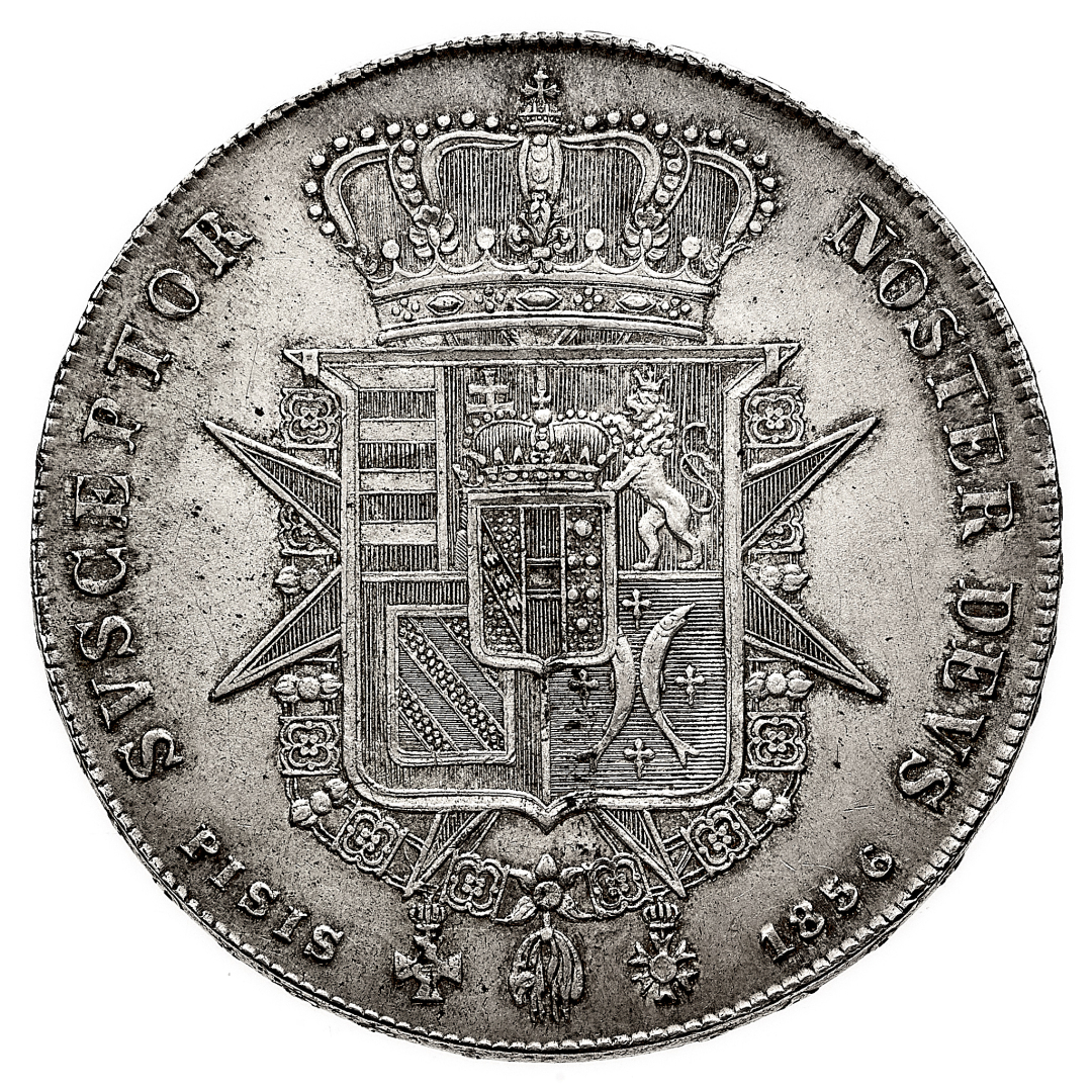 Leopoldo II di Lorena (1824-1859) - Francescone 1856 - Zecca: Firenze - Diritto: effigie del Granduca a destra - Rovescio: stemma coronato sovrapposto alla croce di Santo Stefano e circondata dal Collare del Toson d'Oro - gr. 27,44 - SPL