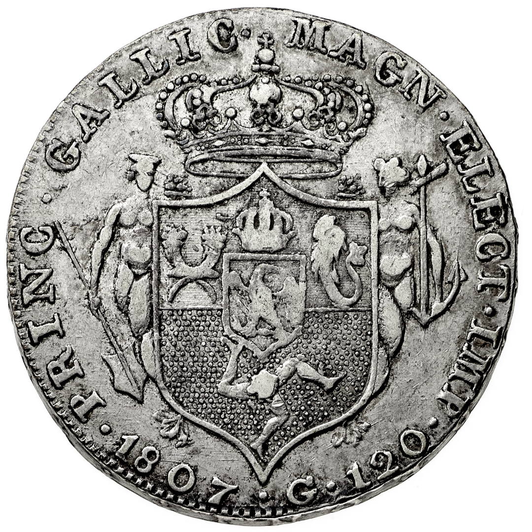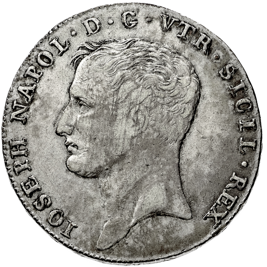 Giuseppe Napoleone (1806-1808) - Piastra da 120 Grana 1807 - Zecca: Napoli - Diritto: effigie di Giuseppe Napoleone a sinistra - Rovescio: stemma coronato sorretto da due sirene - gr. 27,54 - Rara - Migliore di BB
