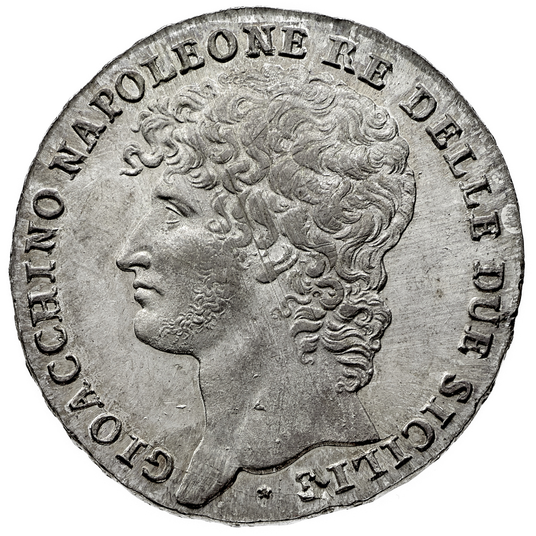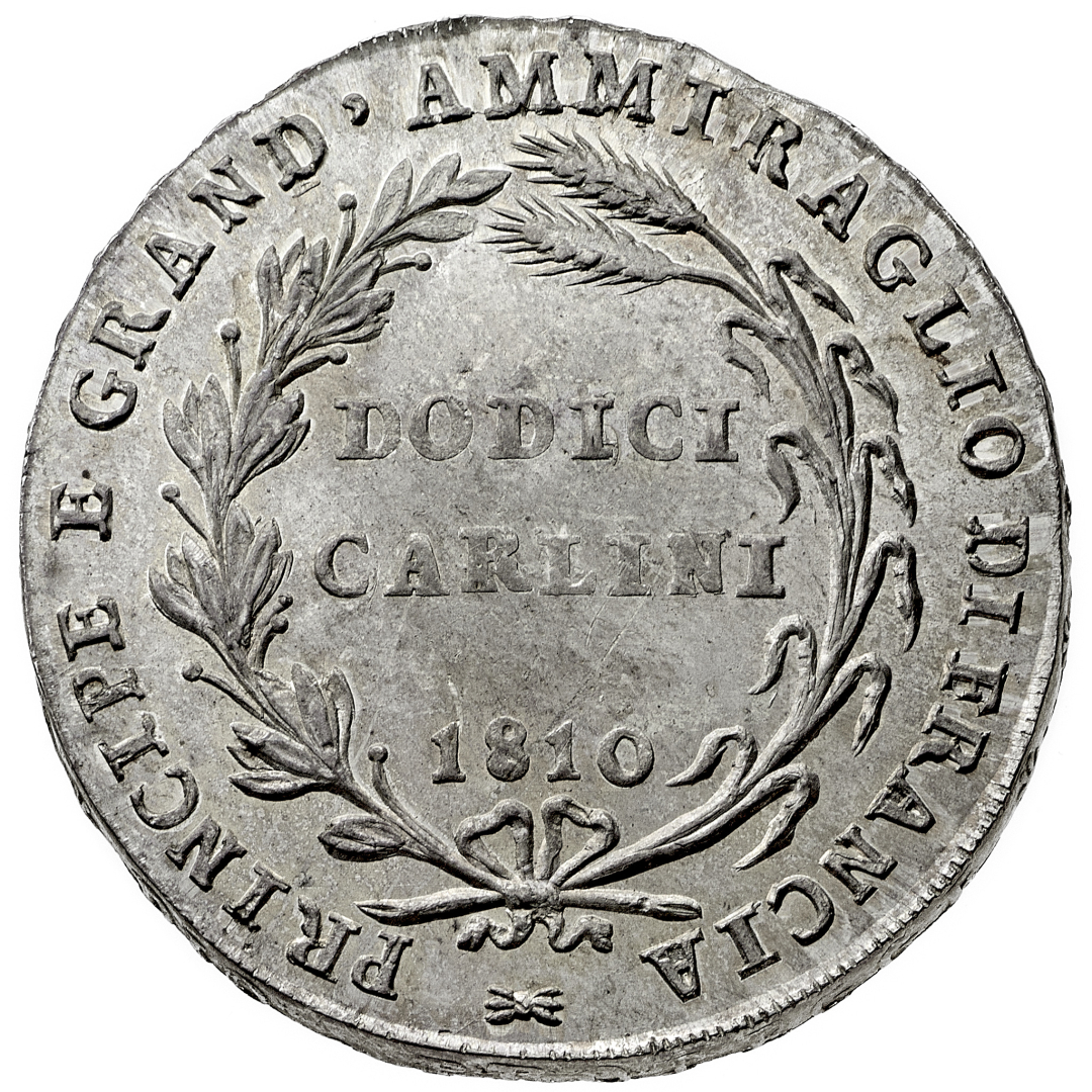 Gioacchino Murat (1808-1815) - Piastra da 12 Carlini 1810 NGC MS 63 - Zecca: Napoli - Diritto: effigie di Gioacchino a destra - Rovescio: valore e data entro un ramo di ulivo e uno stelo di grano intrecciati alla base - gr. 27,54 - Molto rara in questa conservazione - Cert. #8585048-006 (TOP POP!)
