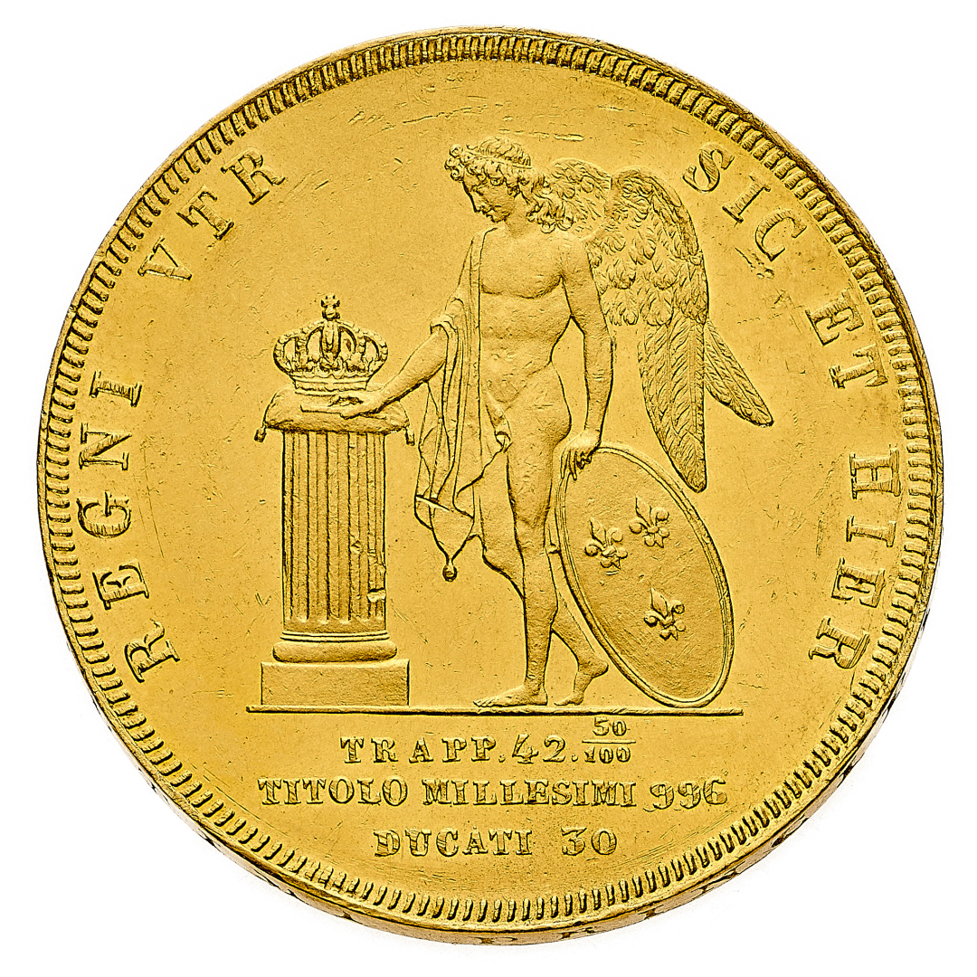 Ferdinando II di Borbone (1830-1859) - 30 Ducati 1850 - Zecca: Napoli - Diritto: effigie del Re a destra - Rovescio: il Genio alato stante a sinistra poggia la mano destra su un troncone di colonna coronato e tiene con la sinistra uno scudo ovale con i gigli di Borbone - gr. 37,88 - Rara - Migliore di SPL