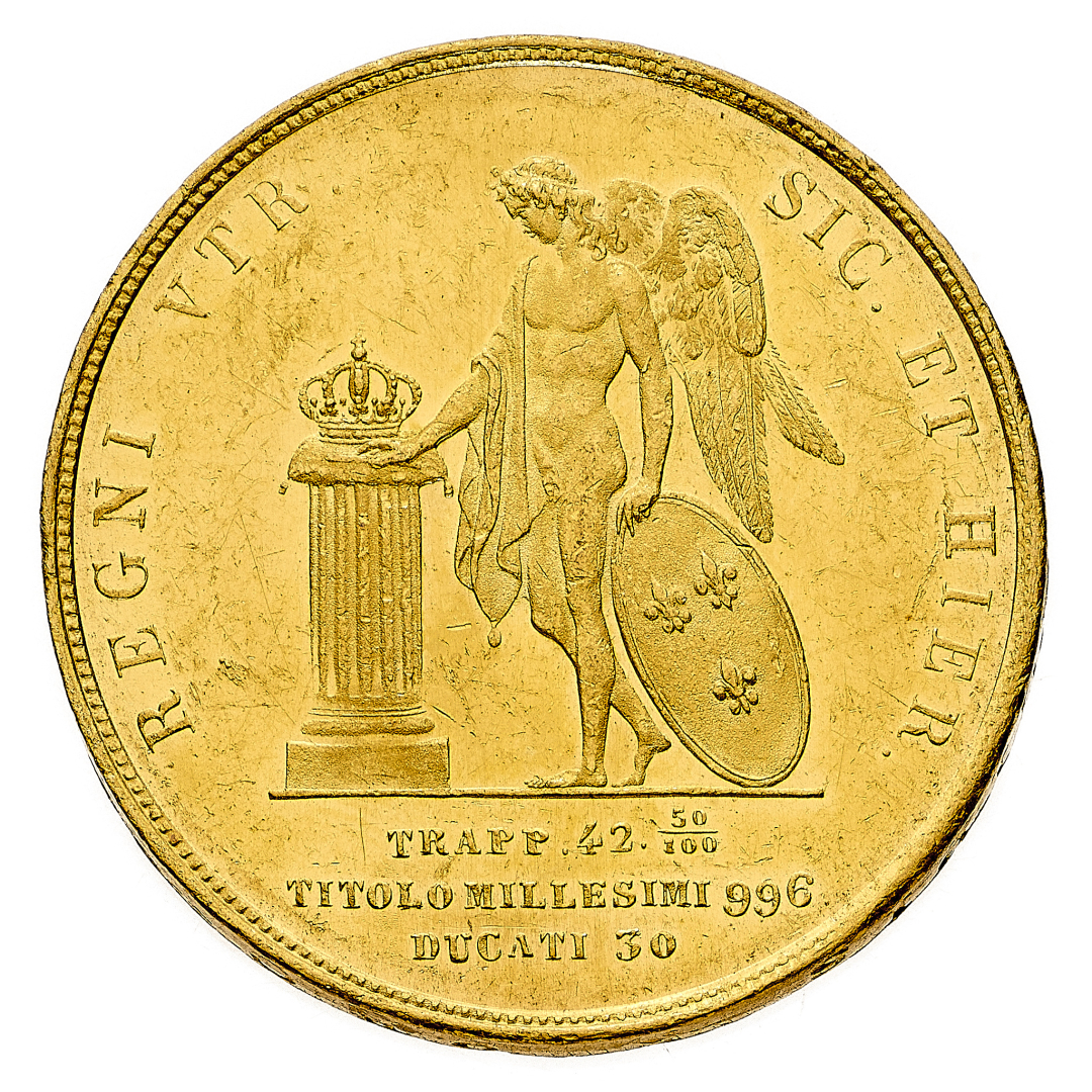 Ferdinando II di Borbone (1830-1859) - 30 Ducati 1854 - Zecca: Napoli - Diritto: effigie del Re a destra - Rovescio: il Genio alato stante a sinistra poggia la mano destra su un troncone di colonna coronato e tiene con la sinistra uno scudo ovale con i gigli di Borbone - gr. 37,89 - Rara - Lievi segni sui bordi, altrimenti migliore di SPL