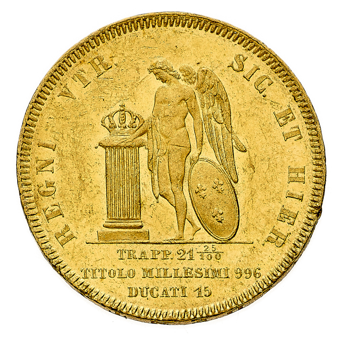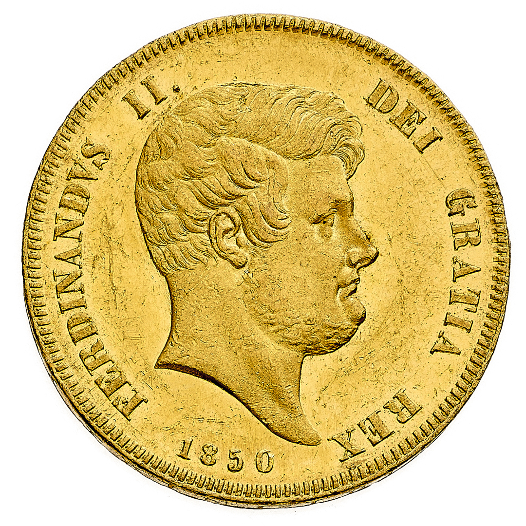 Ferdinando II di Borbone (1830-1859) - 15 Ducati 1850 - Zecca: Napoli - Diritto: effigie del Re a destra - Rovescio: il Genio alato stante a sinistra poggia la mano destra su un troncone di colonna coronato e tiene con la sinistra uno scudo ovale con i gigli di Borbone - gr. 18,92 - Rara - Lieve colpetto sul contorno, altrimenti migliore di SPL