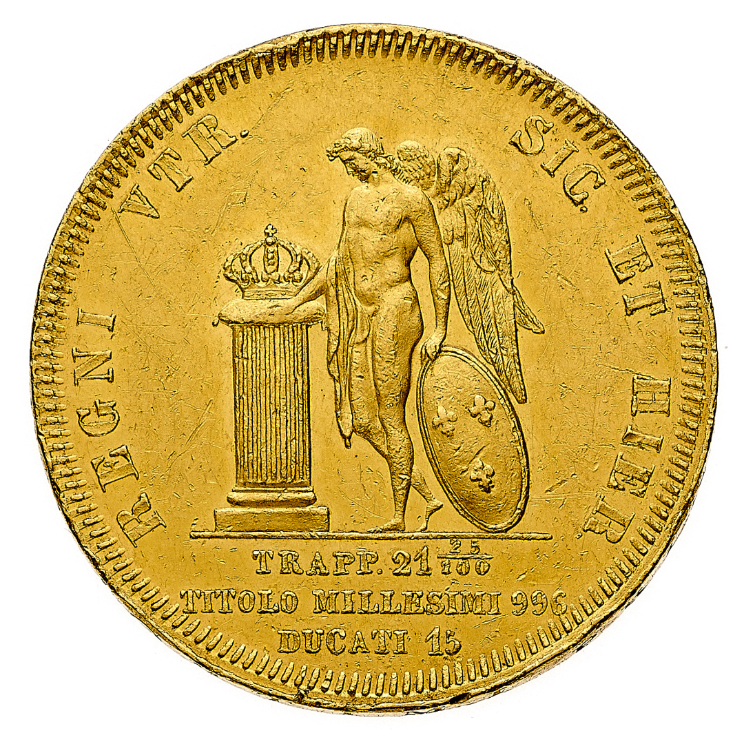 Ferdinando II di Borbone (1830-1859) - 15 Ducati 1852 - Zecca: Napoli - Diritto: effigie del Re a destra - Rovescio: il Genio alato stante a sinistra poggia la mano destra su un troncone di colonna coronata e tiene con la sinistra uno scudo ovale con i gigli di Borbone - gr. 18,94 - Rara - Lievi graffi al diritto e colpetto al contorno, q.SPL