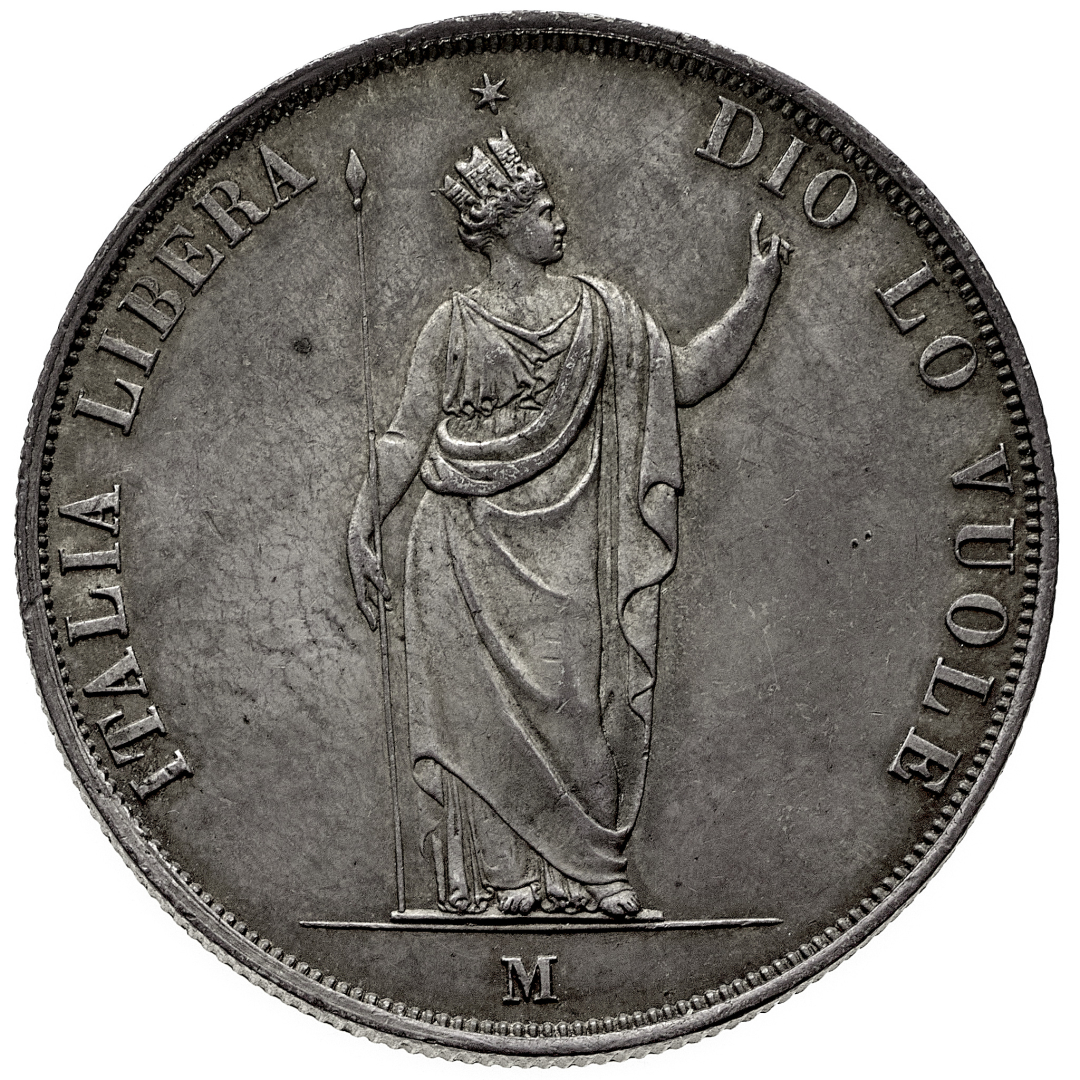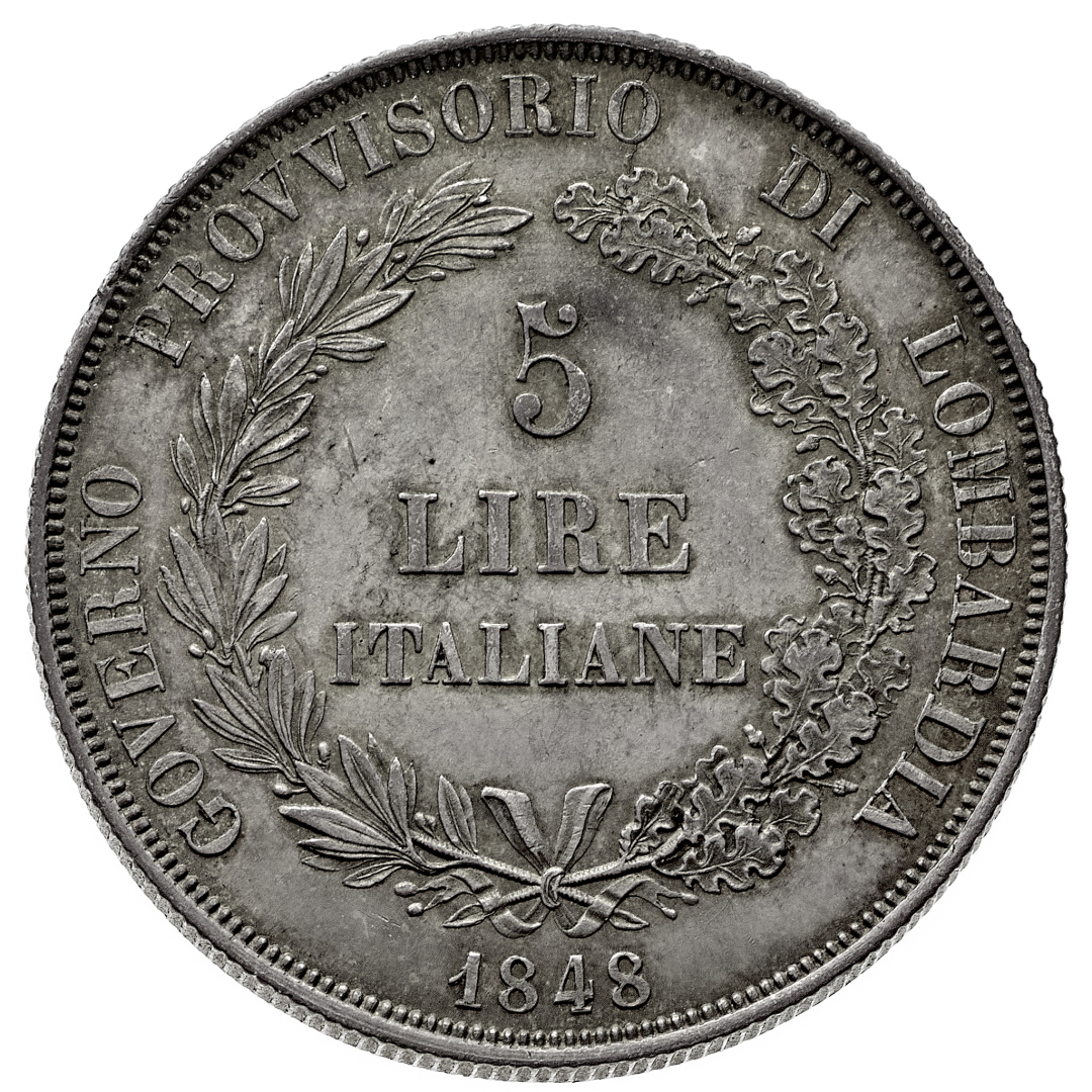Lombardia - 5 Lire 1848 - Zecca: Milano - Diritto: valore entro corona di alloro e di quercia - Rovescio: l'Italia turrita stante con asta - gr. 25,02 - Patina di medagliere, migliore di SPL