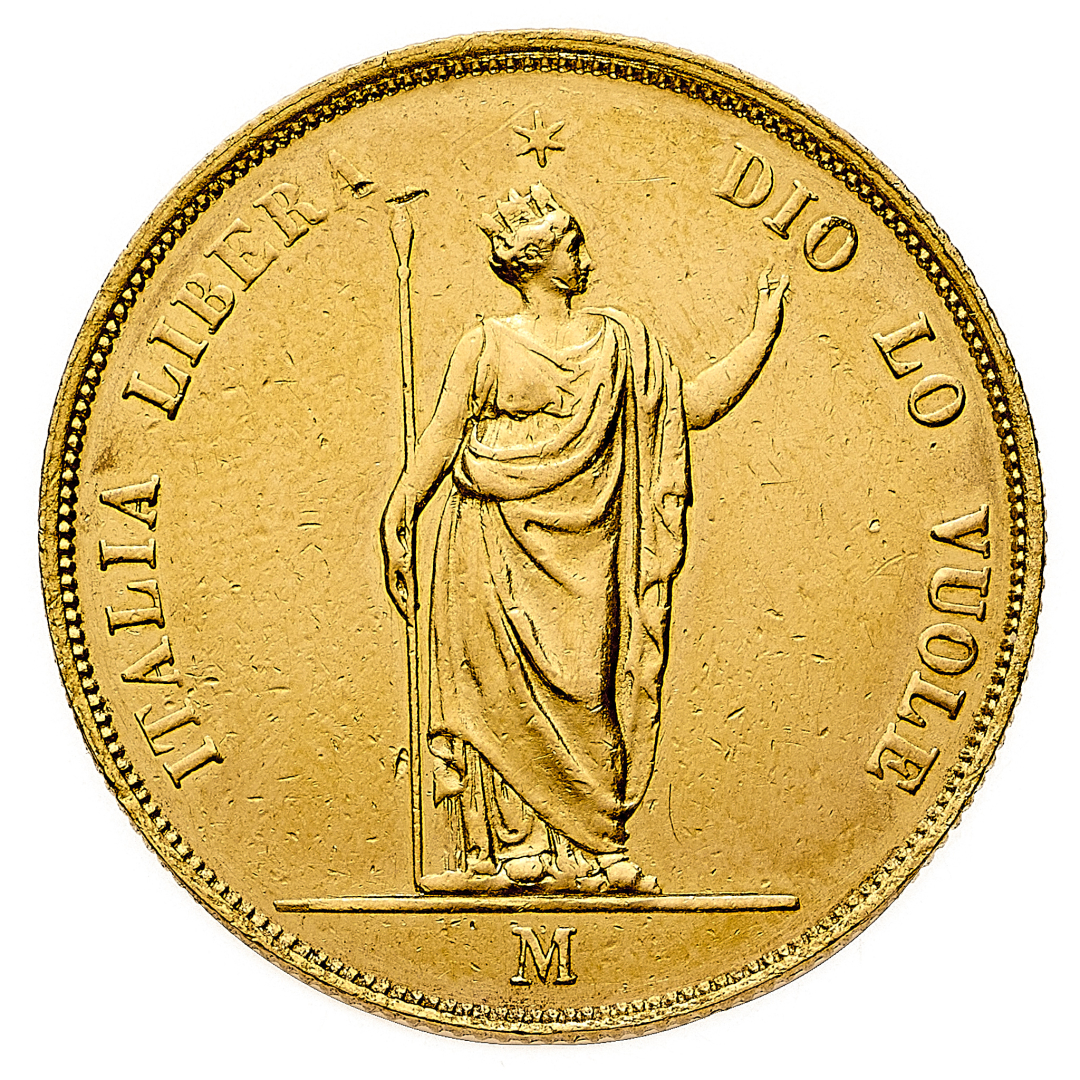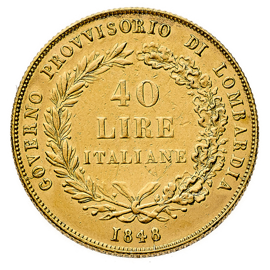 Lombardia - 40 Lire 1848 - Zecca: Milano - Diritto: valore entro corona di alloro e di quercia - Rovescio: Italia turrita stante con asta - gr. 12,87 - Possibili tracce di montatura, q.SPL
