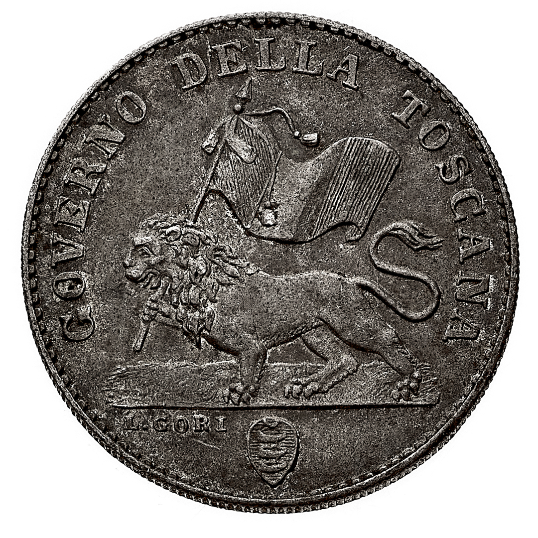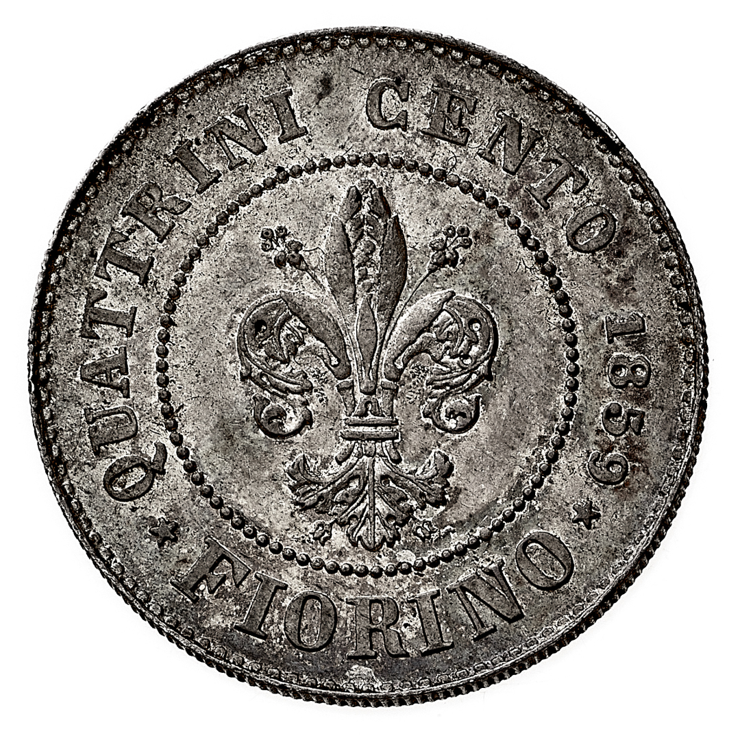Toscana - Fiorino 1859 - Zecca: Firenze - Diritto: leone a sinistra tiene il vessillo della Repubblica con la zampa anteriore destra - Rovescio: giglio fiorentino - gr. 6,82 - Patina di antica collezione, migliore di SPL