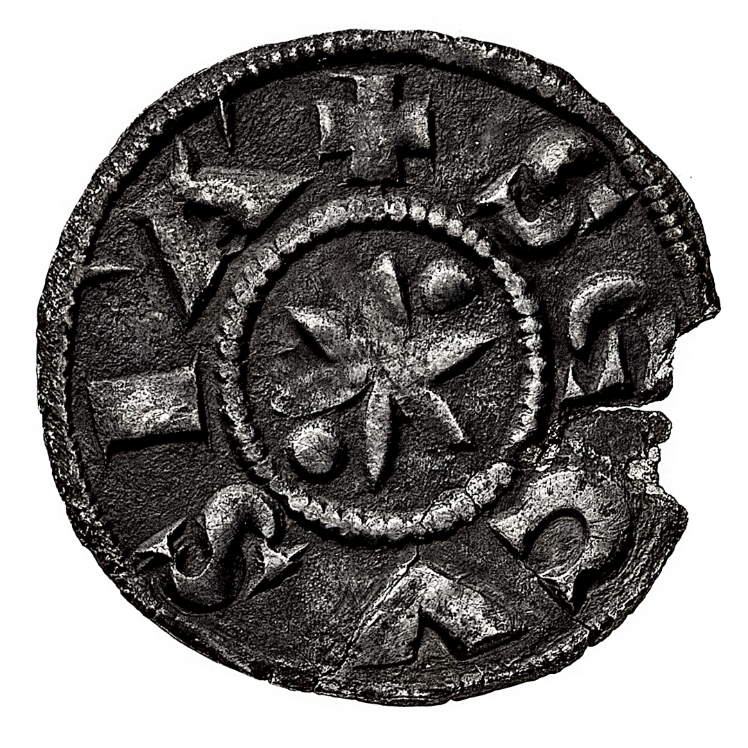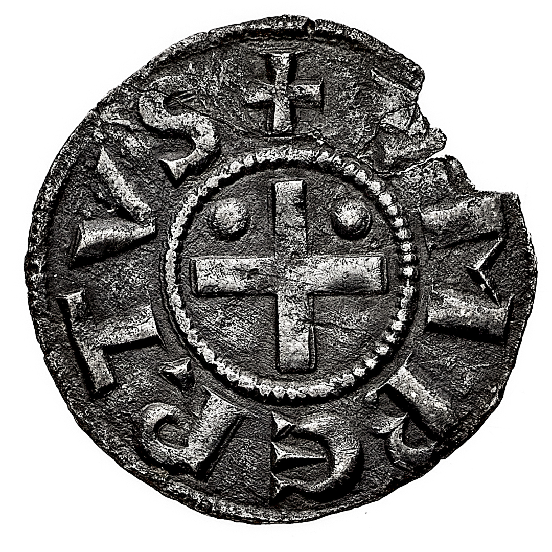 Denaro Secusino di I tipo - Zecca: Susa - Diritto: croce piana con due globetti nei quarti superiori - Rovescio: stella a sei punte di piccole dimensioni con due bisanti in palo - gr. 0,79 - Non comune - Mancanza al contorno, BB