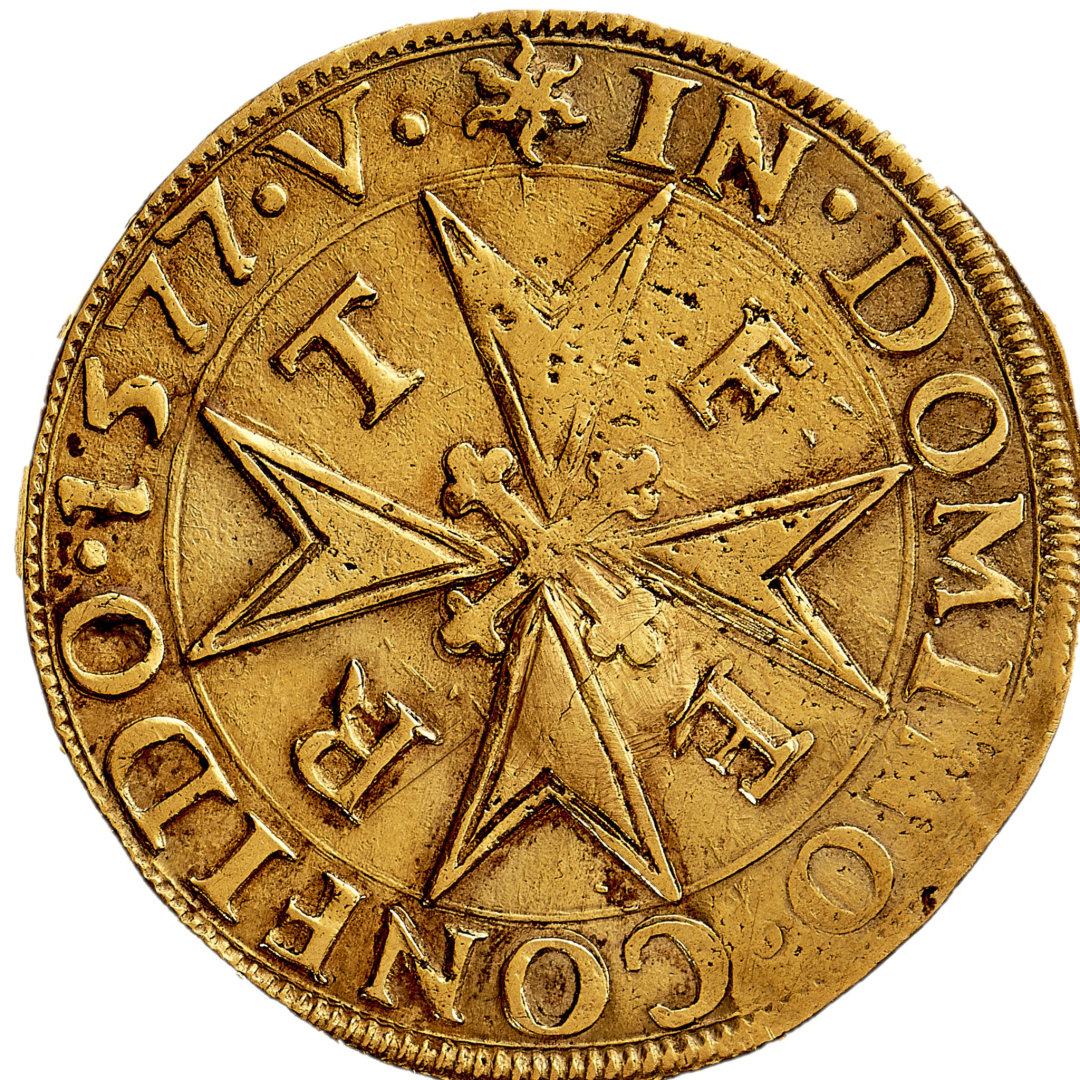 Doppia con lo stemma 1577 - Zecca: Vercelli - Diritto: stemma completo di Casa Savoia coronato - Rovescio: croce di San Lazzaro con croce mauriziana al centro, accantonata da FERT - gr. 6,71 - Molto rara - Lieve traccia di montatura, BB