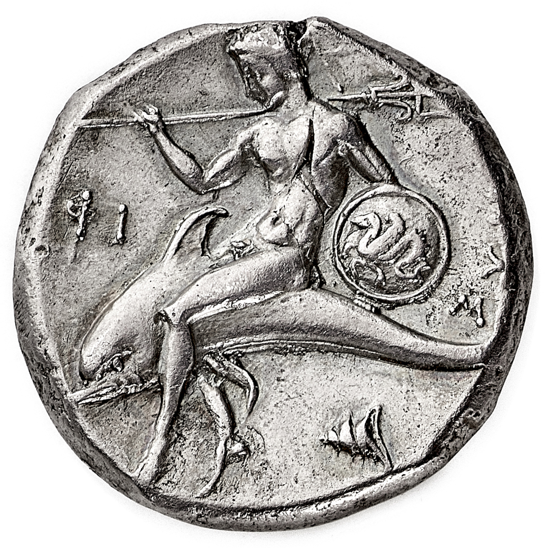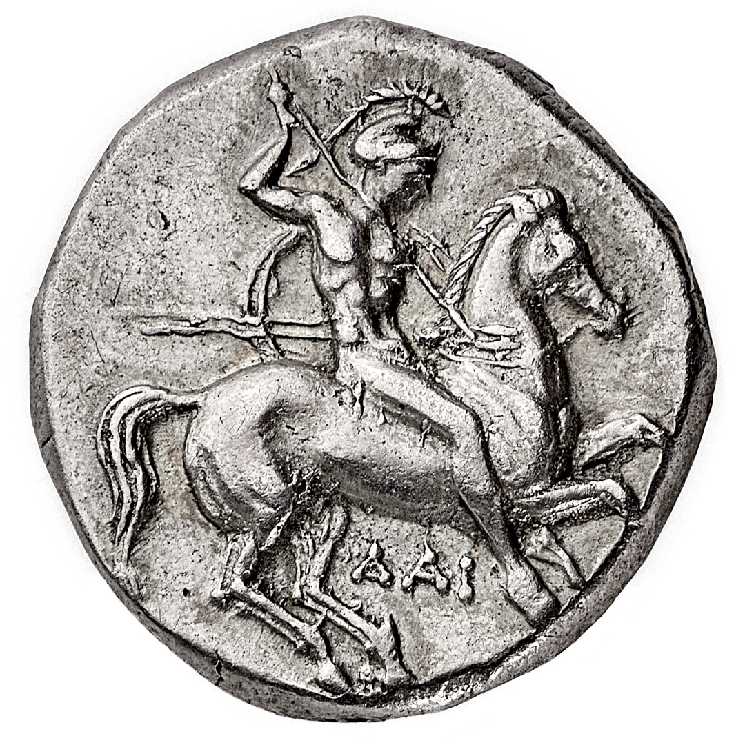 Taranto - Didramma databile al periodo 332-302 a.C. - Diritto: guerriero al galoppo verso destra, rivolge un giavellotto che brandisce con la mano destra, e tiene due lance e uno scudo con la sinistra - Rovescio: Taras, in groppa al delfino verso sinistra, tiene un tridente con la mano destra e uno scudo con la sinistra - gr. 7,85 - Lieve frattura di conio, SPL