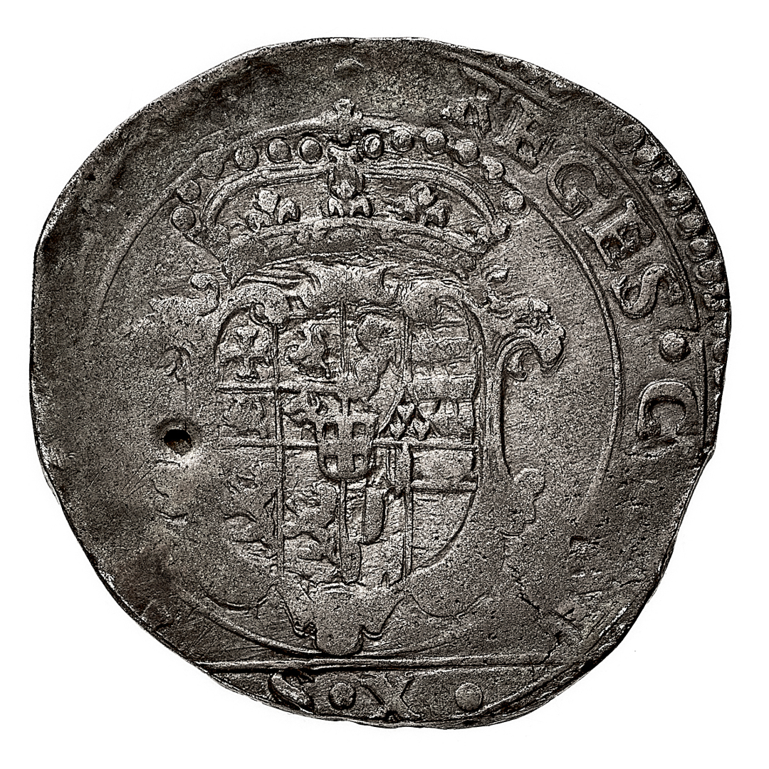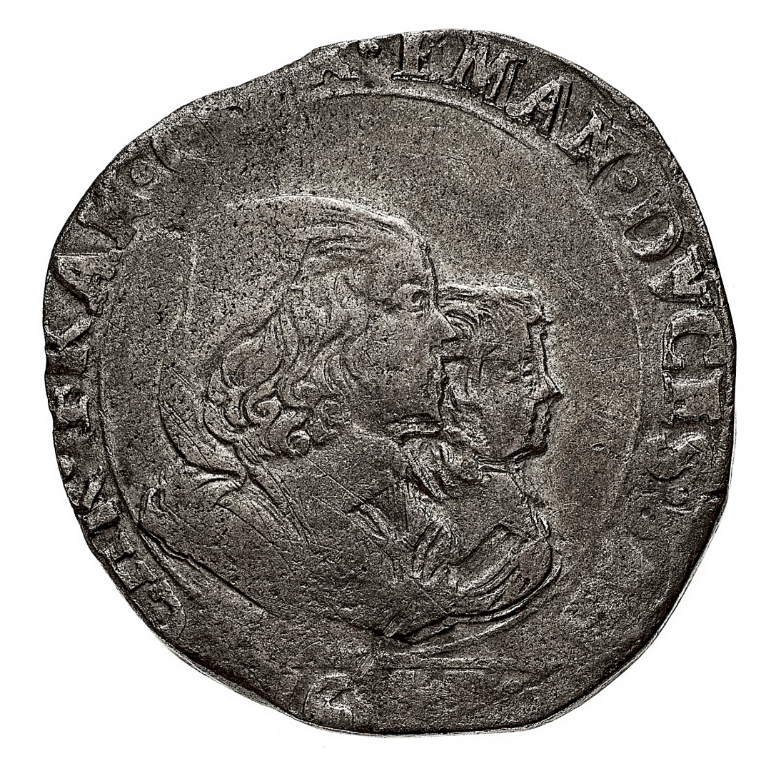 Periodo della Reggenza (1638-1648) - Mezza Lira s.d. - Zecca: Torino - Diritto: busti del Duca e della Reggente accollati a destra - Rovescio: stemma completo di Casa Savoia coronato - gr. 7,69 - Rara - BB