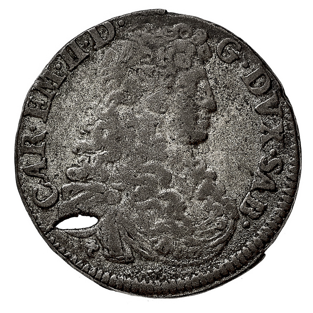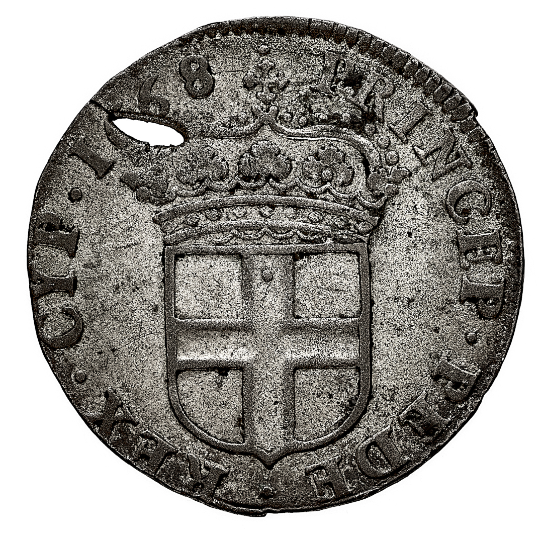 Con il titolo di Duca (1648-1675) - Da 5 Soldi 1668 - Zecca: Torino - Diritto: busto del Duca a destra - Rovescio: stemma di Casa Savoia coronato - gr. 4,80 - Foro passante, q.BB
