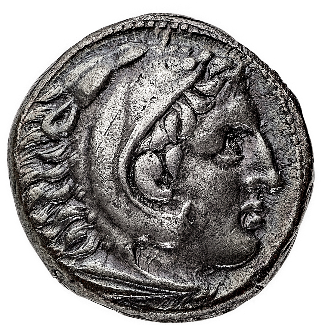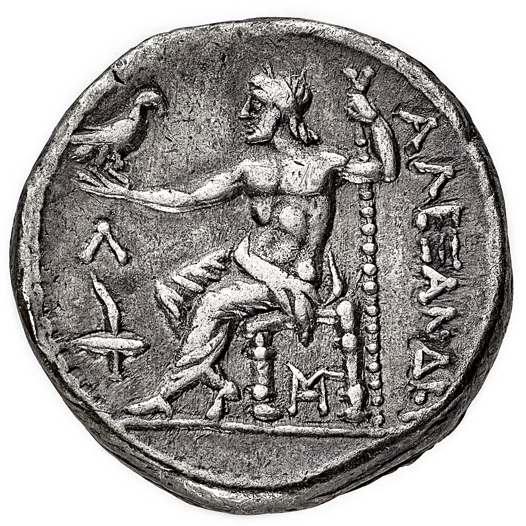 Alessandro III (336-323 a.C.) - Tetradramma postumo databile al periodo 307-297 a.C. - Zecca: Amphipolis - Diritto: testa di Eracle a destra ricoperta dalle fauci del leone - Rovescio: Zeus seduto a sinistra su un trono tiene un'aquila con la mano destra e un lungo scettro verticale con la sinistra; nel campo a sinistra una torcia e la lettera A, sotto il trono un monogramma - gr. 17,11 - Patina iridescente, q.SPL