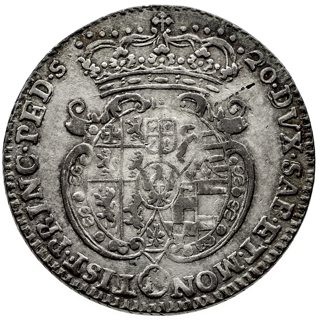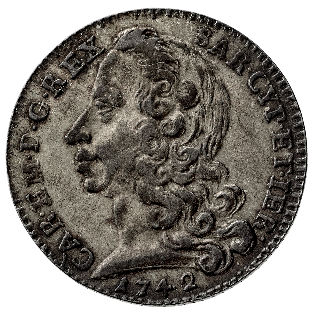 Lira 1742 - Zecca: Torino - Diritto: testa del Re a sinistra - Rovescio: stemma completo di Casa Savoia coronato e circondato dal Collare dell'Annunziata - gr. 5,74 - Rara - Migliore di BB - Corredata da cartellino di antica collezione