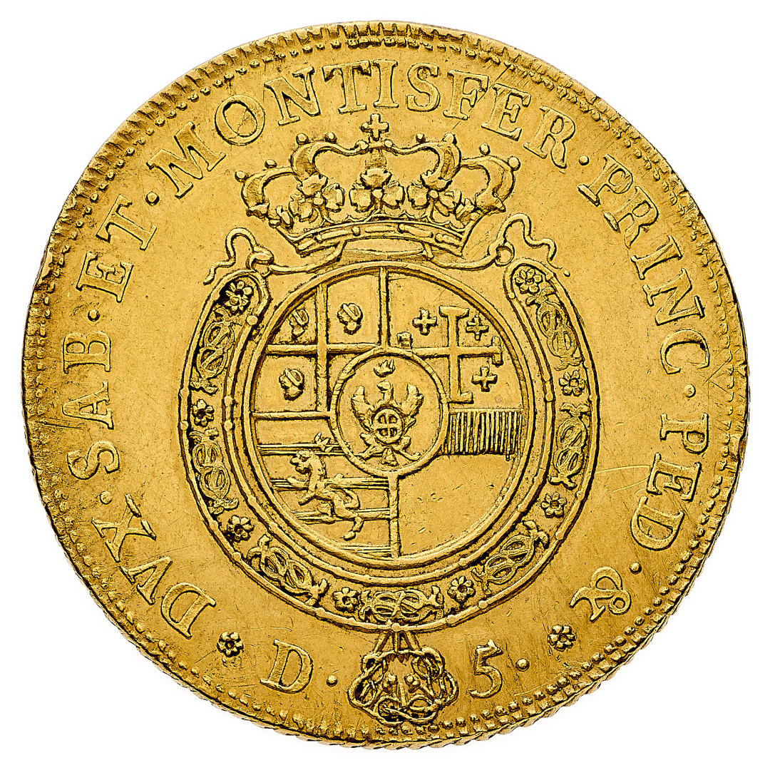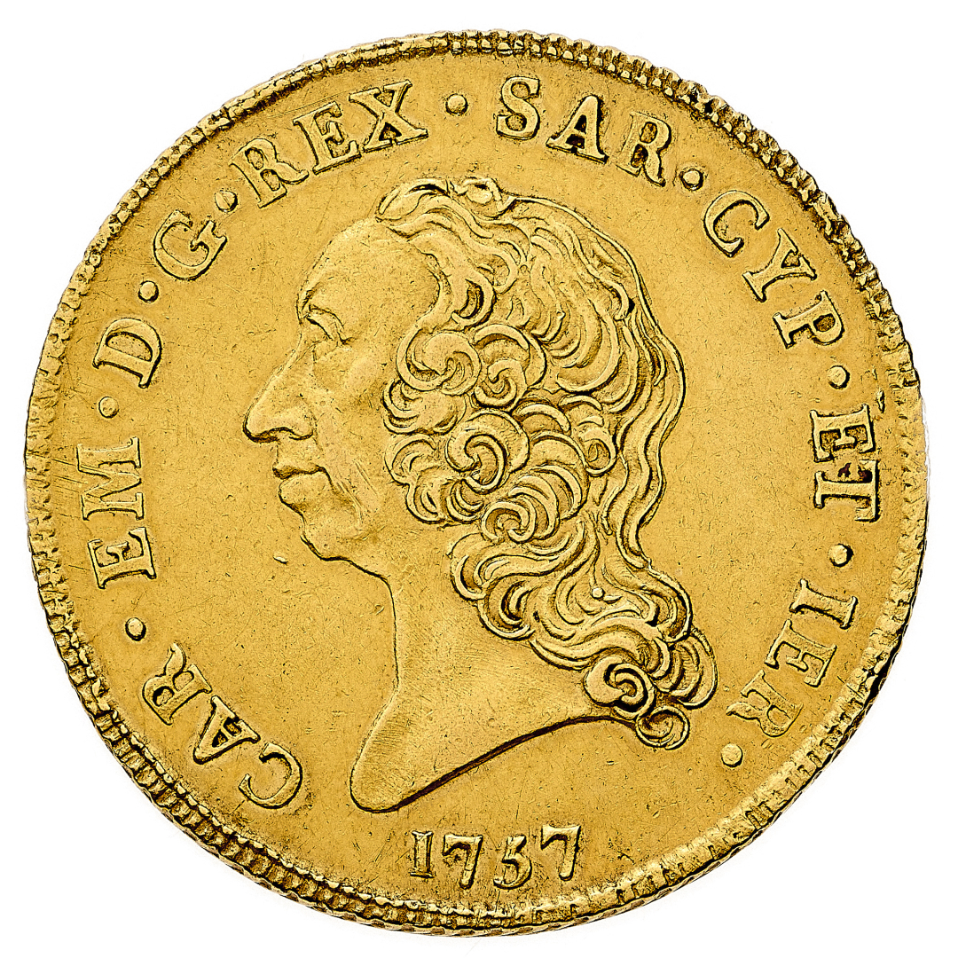 Carlino da 5 Doppie 1757 - Zecca: Torino - Diritto: effigie del Re a sinistra - Rovescio: stemma completo di Casa Savoia coronato e circondato dal Collare dell'Annunziata - gr. 48,08 - Molto rara - Lievi segni di contatto, q.SPL