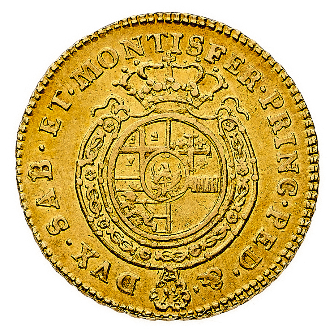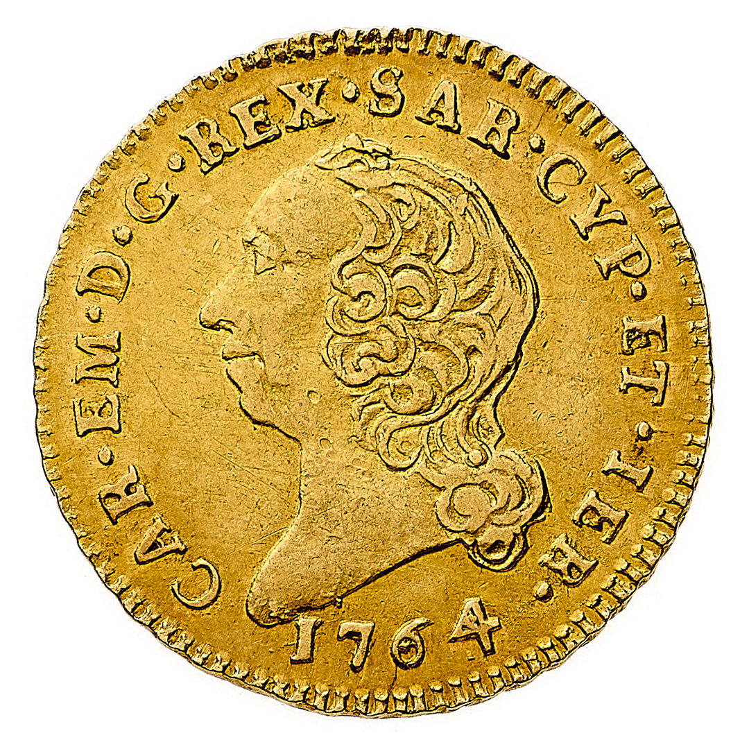 Mezza Doppia 1764 - Zecca: Torino - Diritto: effigie del Re a sinistra - Rovescio: stemma completo di Casa Savoia coronato e circondato dal Collare dell'Annunziata - gr. 4,82 - Rara - q.SPL