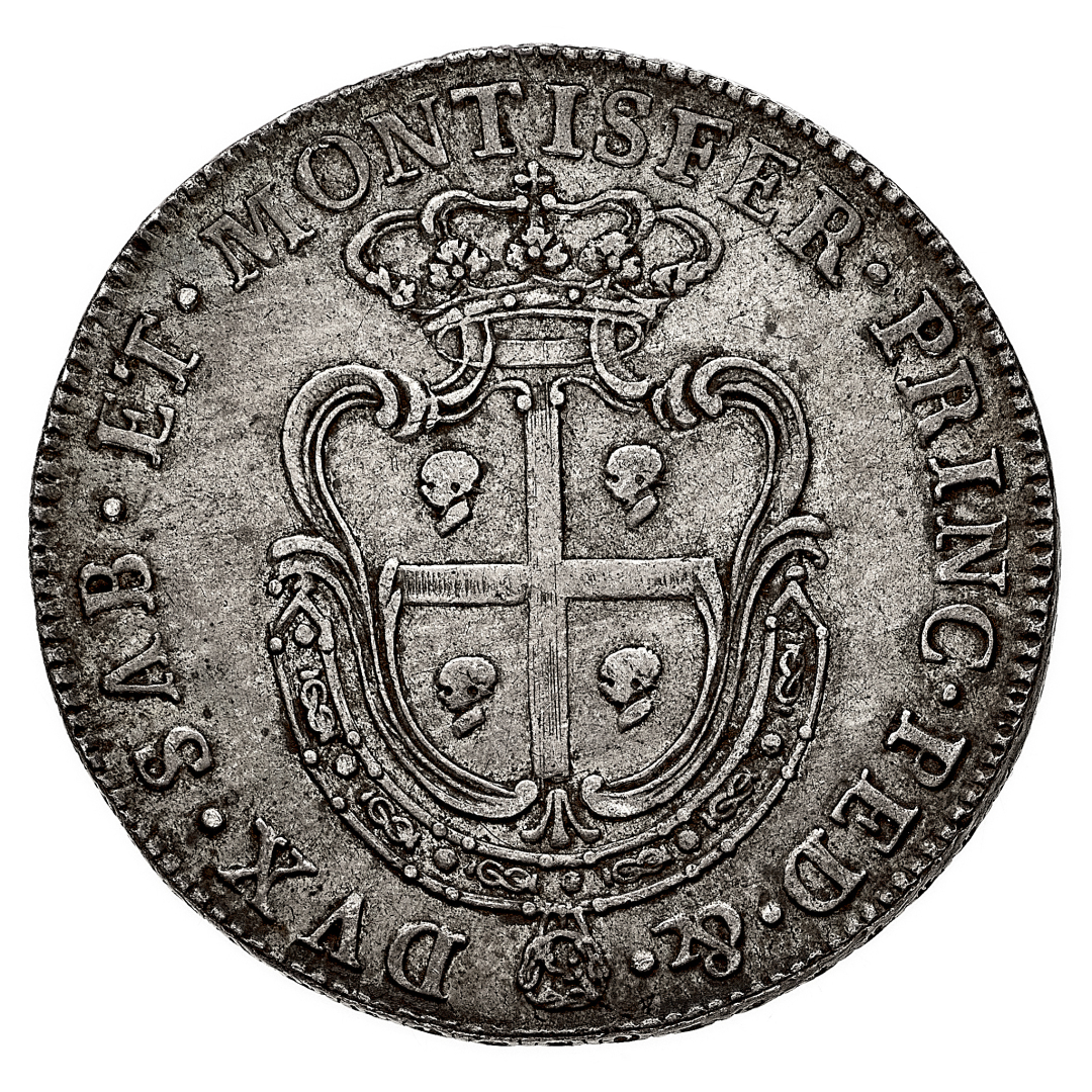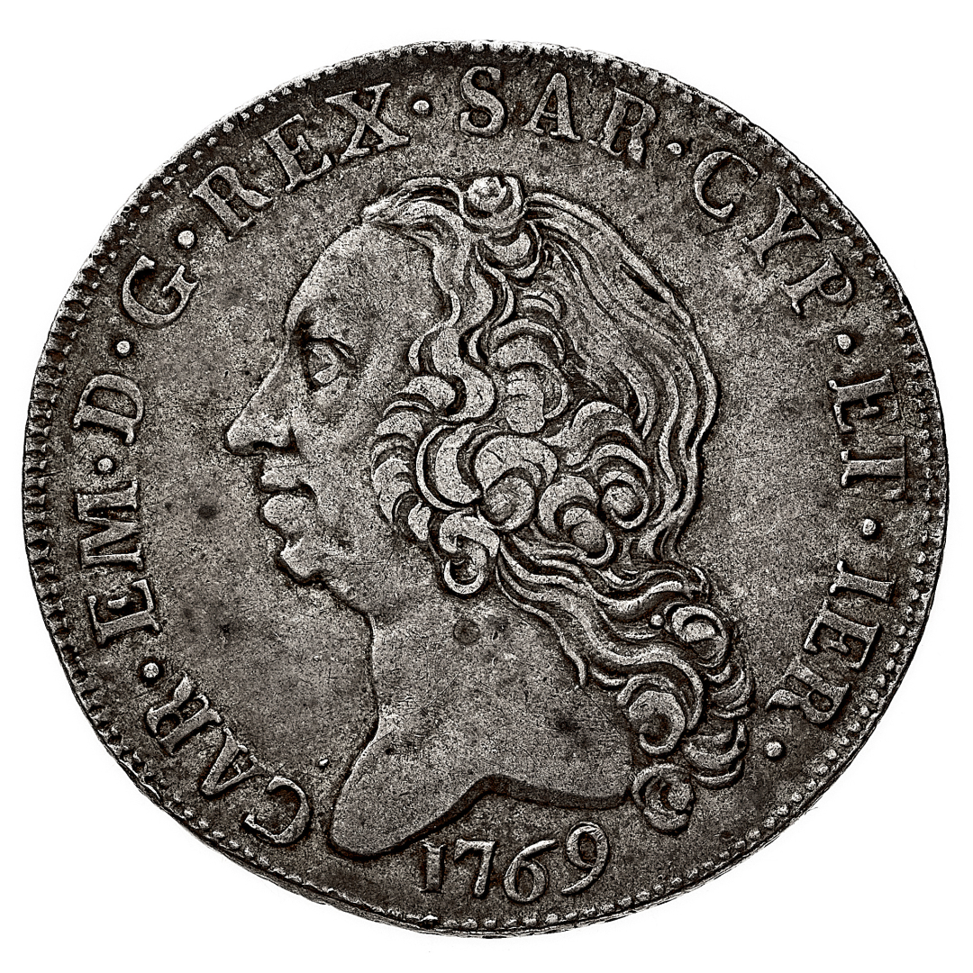 Monetazione per la Sardegna - Scudo Sardo 1769 - Zecca: Torino - Diritto: effigie del Re a sinistra - Rovescio: scudo sardo coronato e ornato dal Collare dell'Annunziata - gr. 23,49 - Molto rara - Patina di medagliere, BB