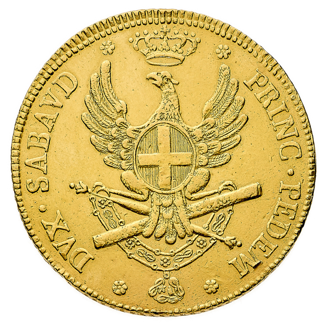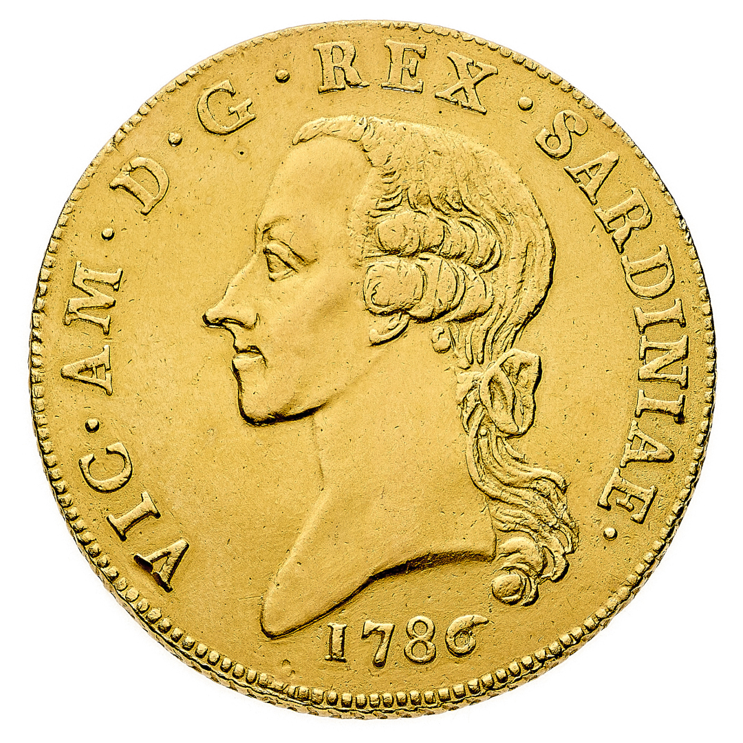 Carlino da 5 Doppie 1786 - Zecca: Torino - Diritto: effigie del Re a sinistra - Rovescio: aquila coronata ad ali spiegate con stemma sabaudo in petto sopra scettro, bastone e Collare dell'Annunziata - gr. 45,39 - Molto rara - Lievi tracce di pulitura, q.SPL