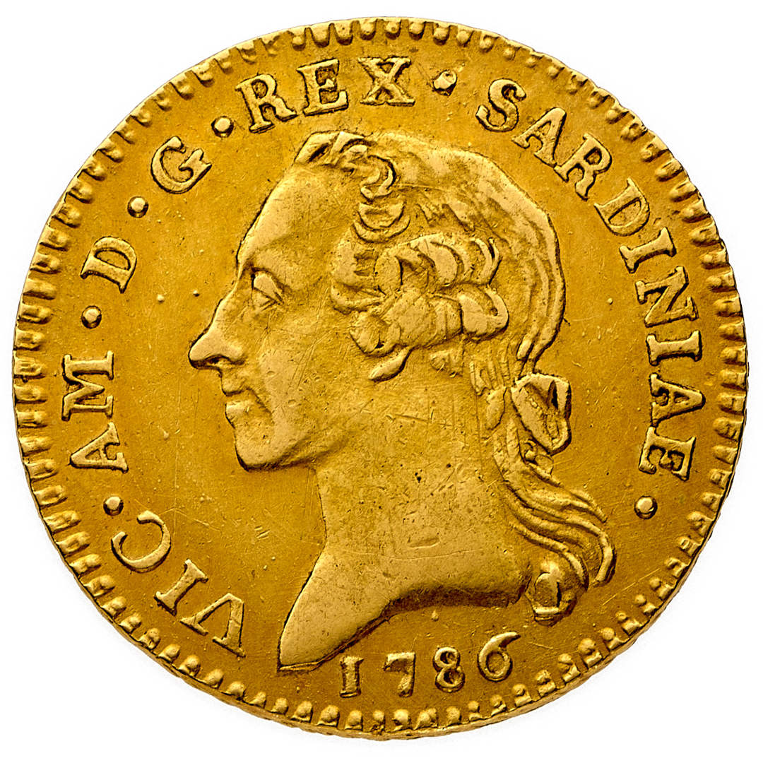 Doppia 1786 - Zecca: Torino - Diritto: effigie del Re a sinistra - Rovescio: aquila coronata con stemma sabaudo in petto sopra scettro, bastone e Collare dell'Annunziata - gr. 9,12 - q.SPL