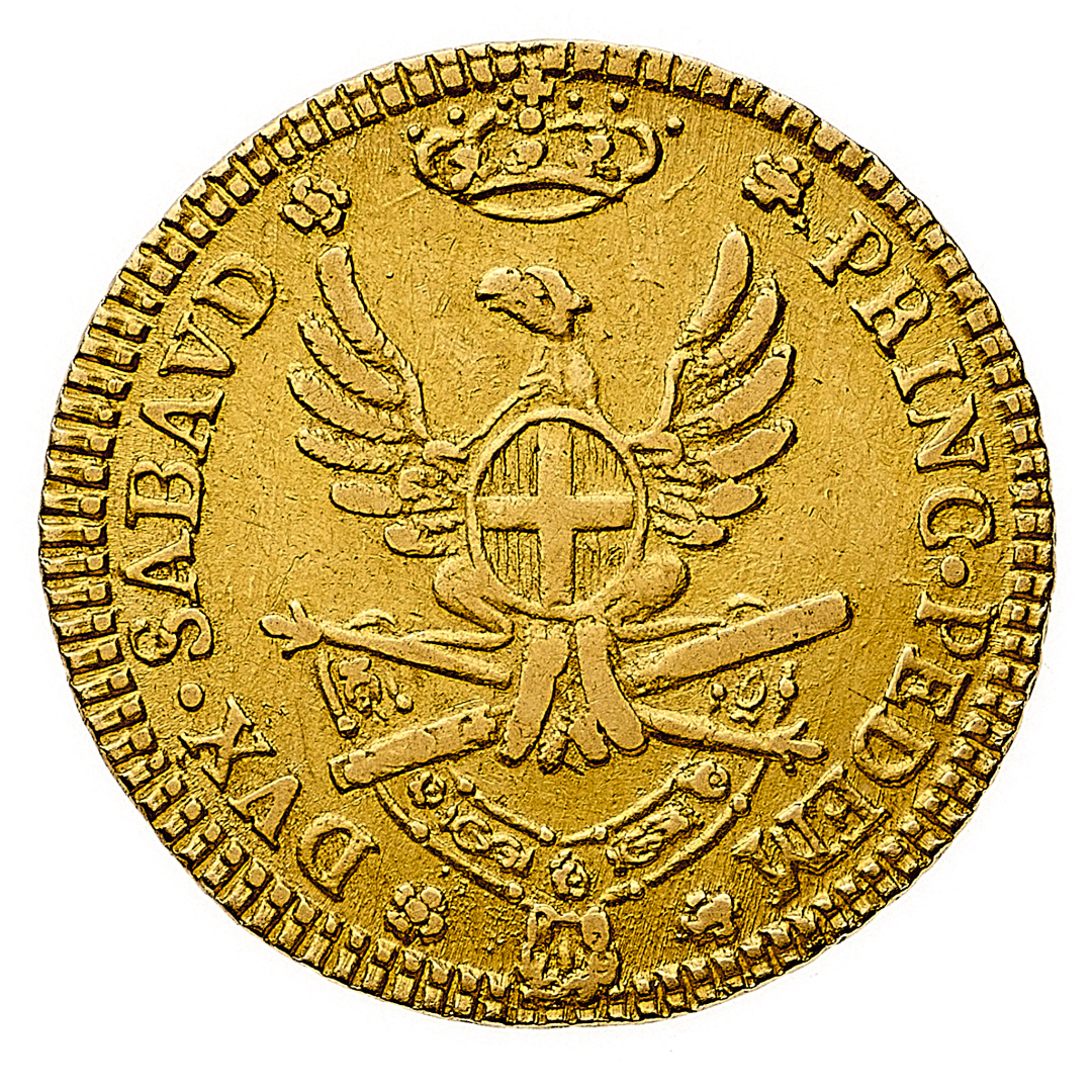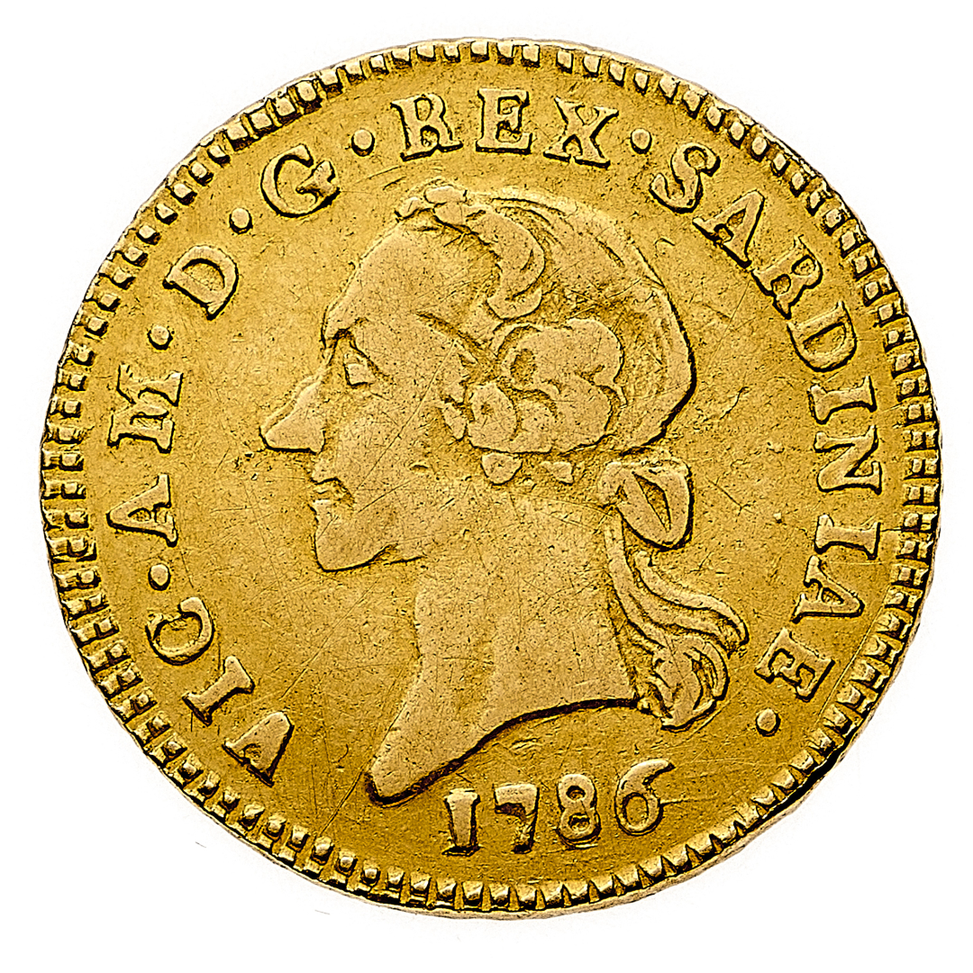 Mezza Doppia 1786 - Zecca: Torino - Diritto: effigie del Re a sinistra - Rovescio: aquila coronata ad ali spiegate con stemma sabaudo in petto sopra scettro, bastone e Collare dell'Annunziata - gr. 4,52 - BB