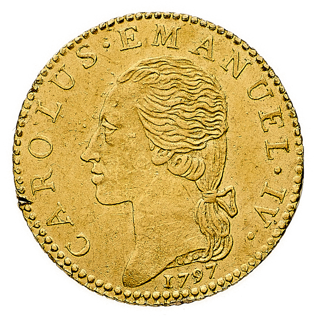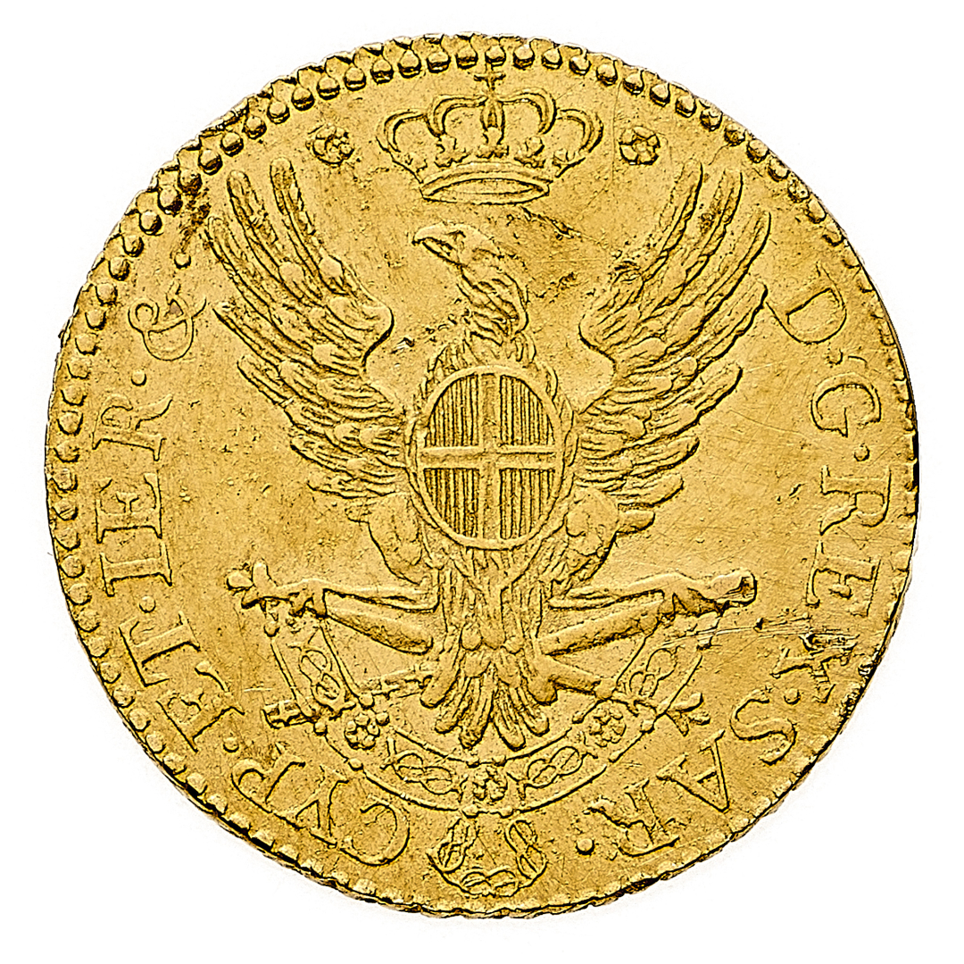 Mezza Doppia 1797 - Zecca: Torino - Diritto: effigie del Re a sinistra - Rovescio: aquila coronata ad ali spiegate con stemma sabaudo in petto sopra scettro, bastone e Collare dell'Annunziata - gr. 4,55 - Rara - Lievi colpetti e segni di contatto, altrimenti SPL