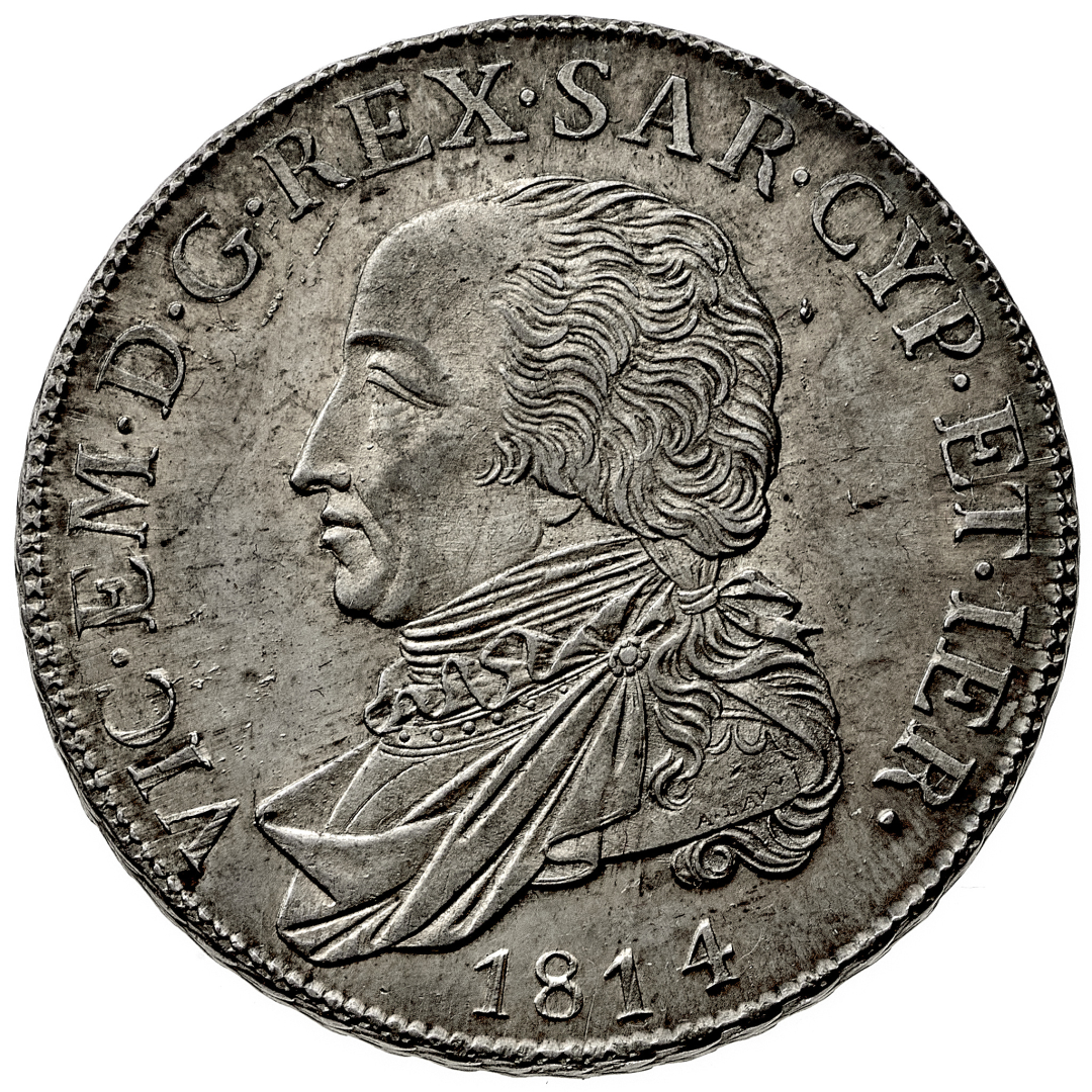 Mezzo Scudo 1814 - Zecca: Torino - Diritto: effigie del Re a sinistra - Rovescio: stemma completo di Casa Savoia coronato e circondato dal Collare dell'Annunziata - gr. 17,61 - Rara - Patina di antica collezione, migliore di SPL